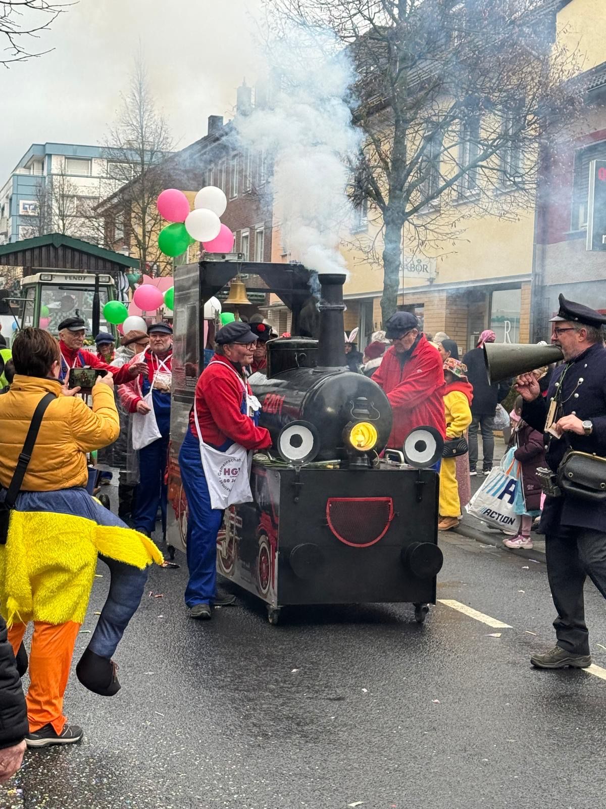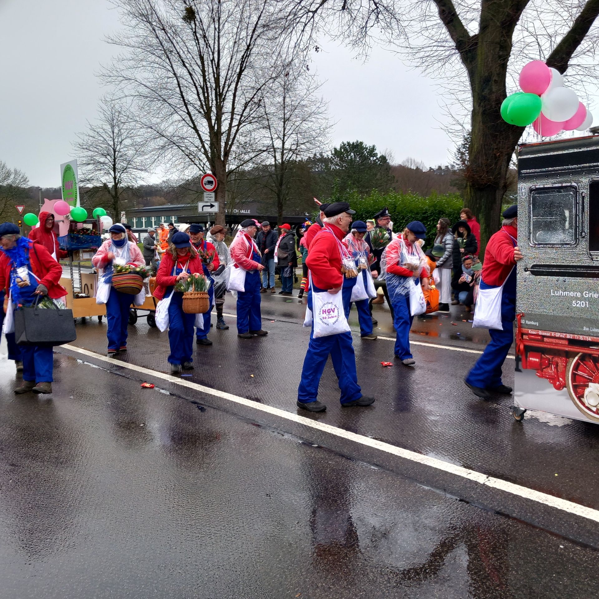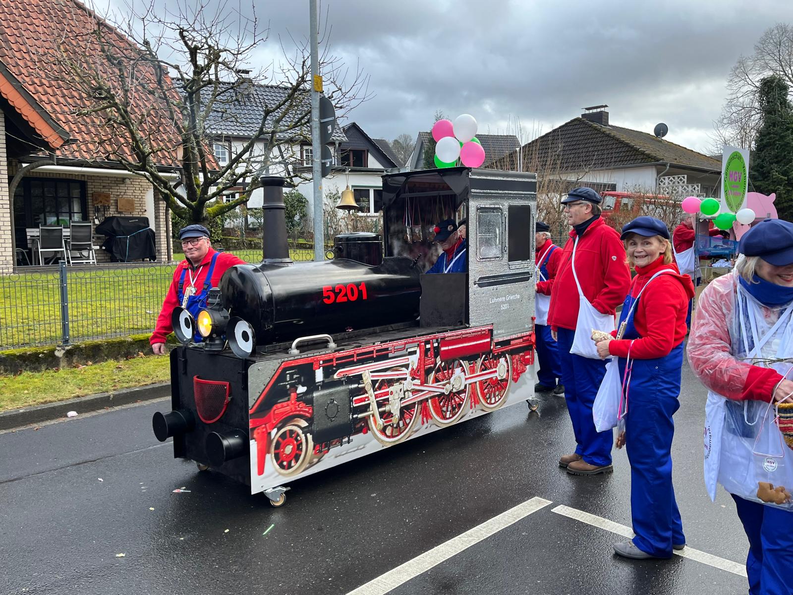 50 Jahre Heimatverein Lohmar e.V. (HGV), da sollte es schon ein besonderes Motto für den diesjährigen Karnevalszug sein. So zogen dann am Montag, dem 16. Februar 2026 insgesamt 27 gut gelaunte Mitglieder des HGV mit der alten Lokomotive „Luhmer Grietche“ und in bunten Kostümen als Jim Knopf, Schaffner, Bahnreisende oder Fahrkarte vom Bahnhof Luhmer-Land im Rosenmontagszug durch Lohmar. Es war uns dabei ein großes Anliegen, auch hier den historischen Hintergrund des Vereins in den Mittelpunkt zu stellen.