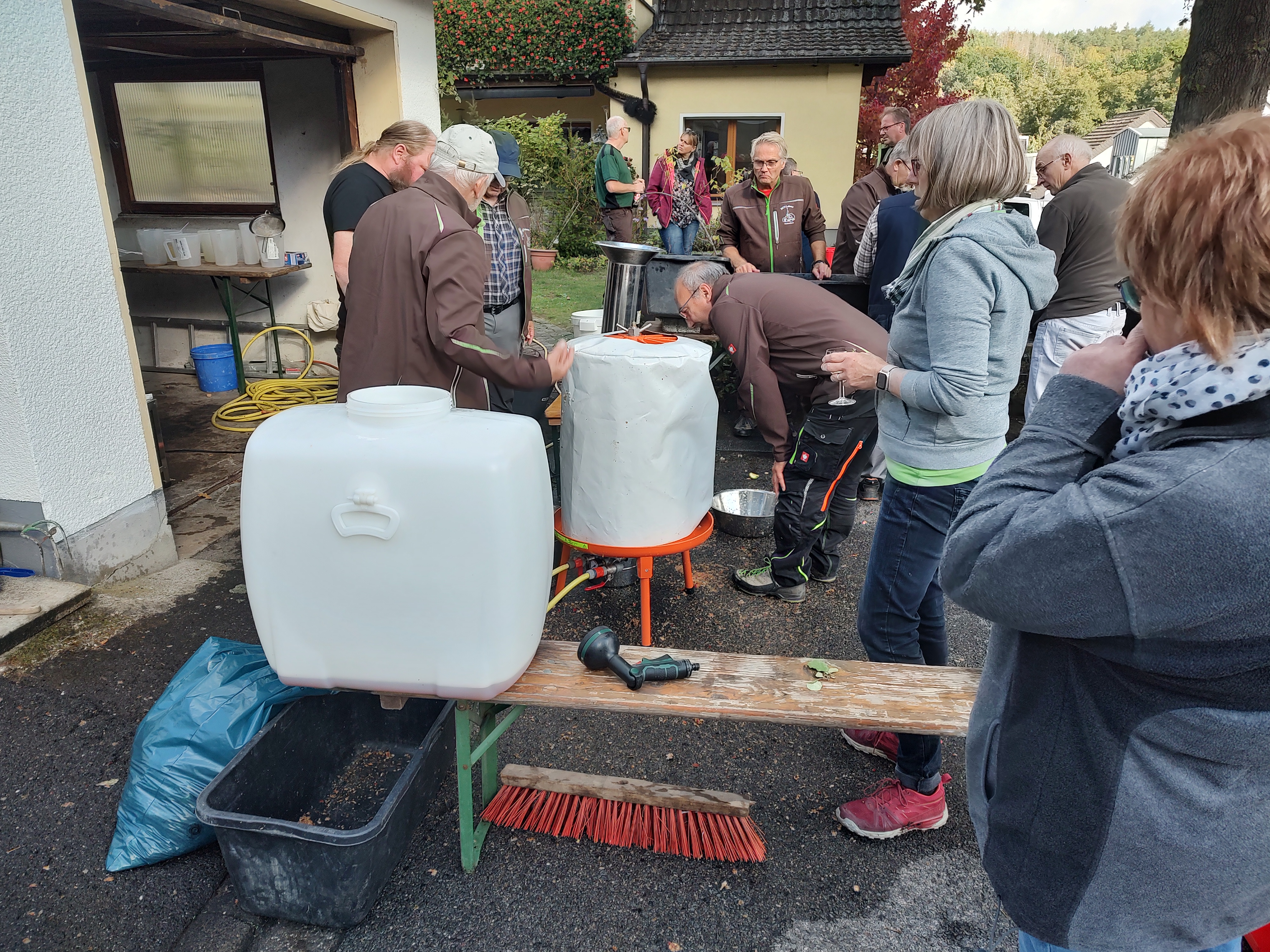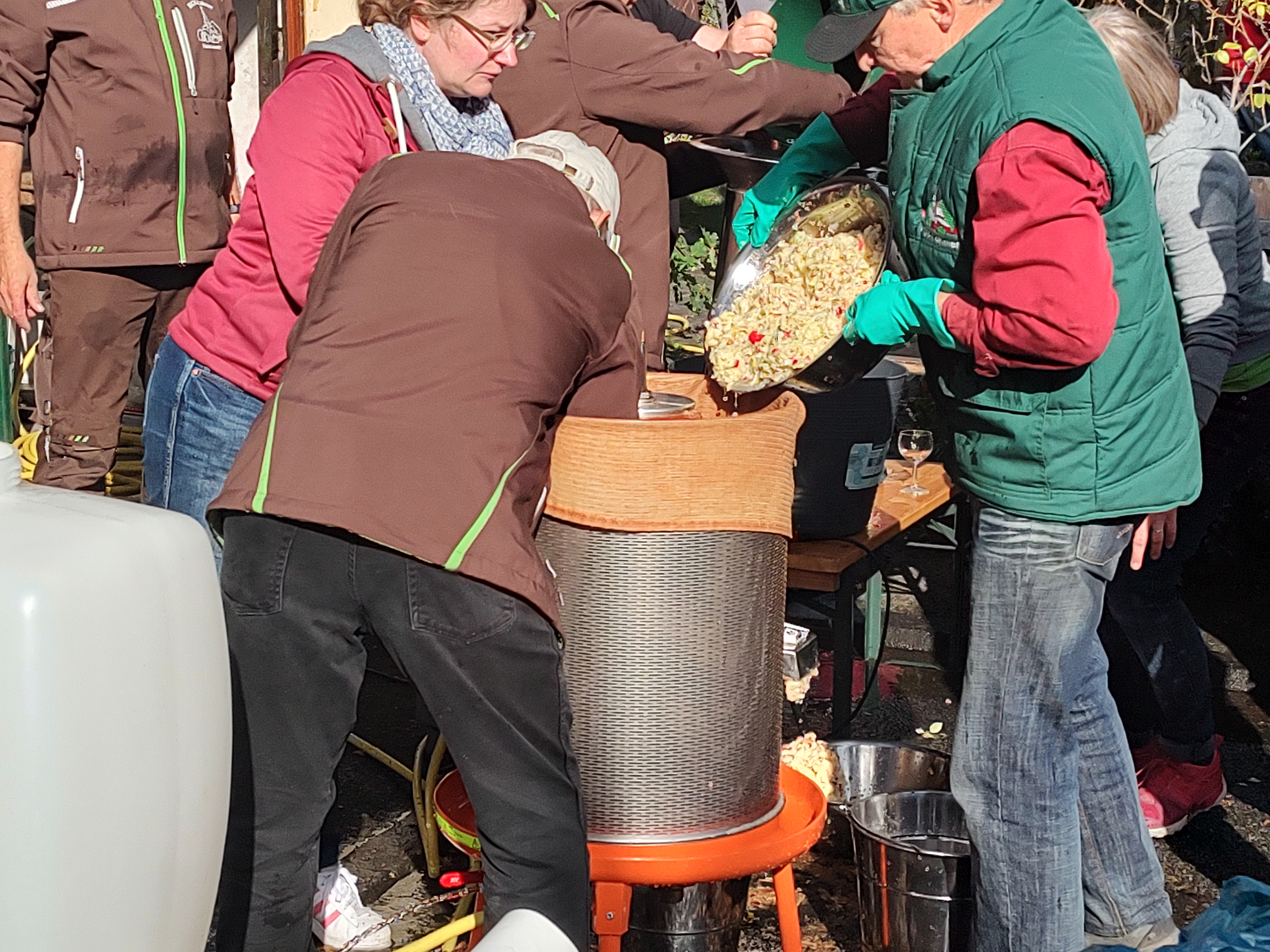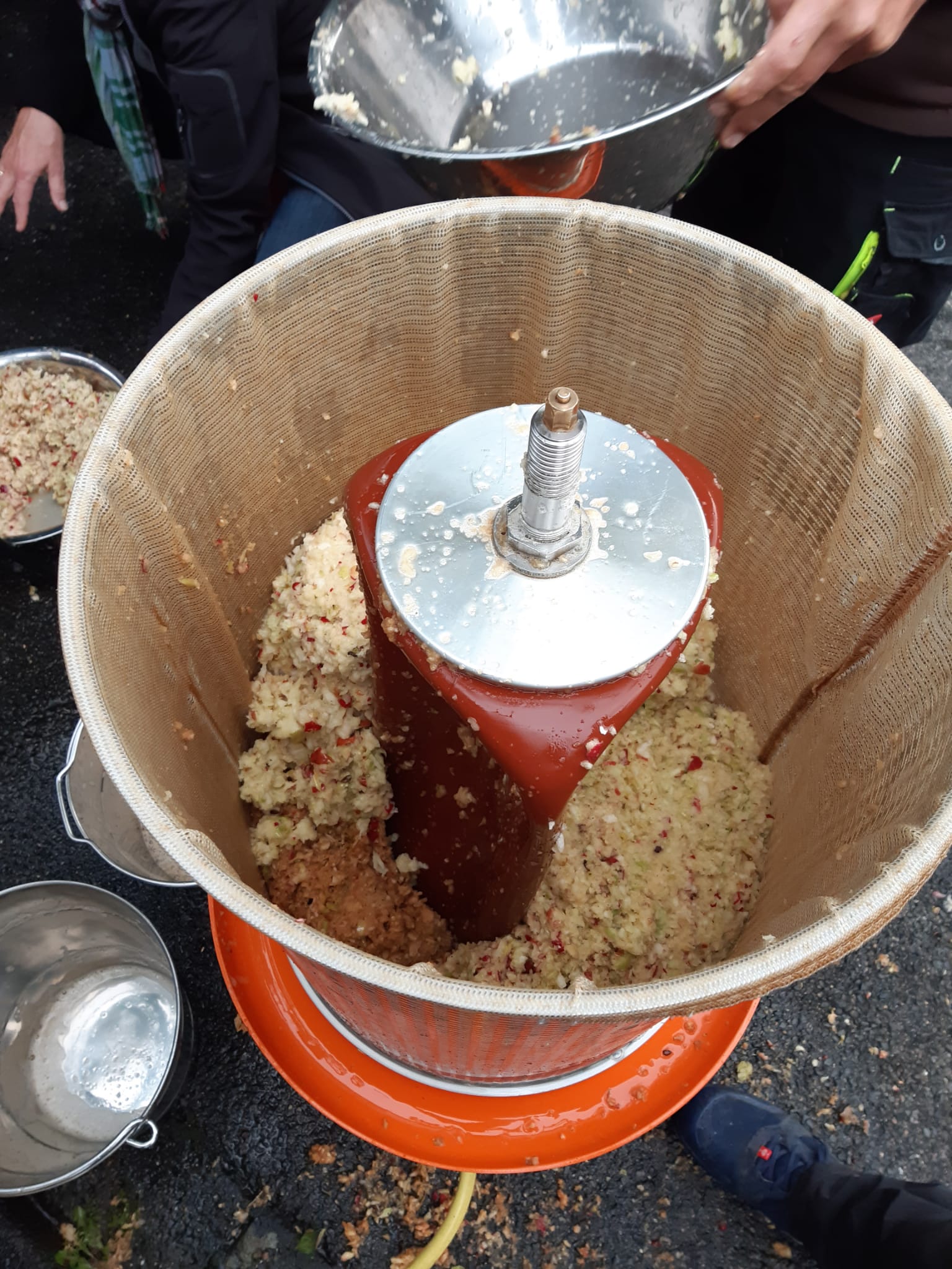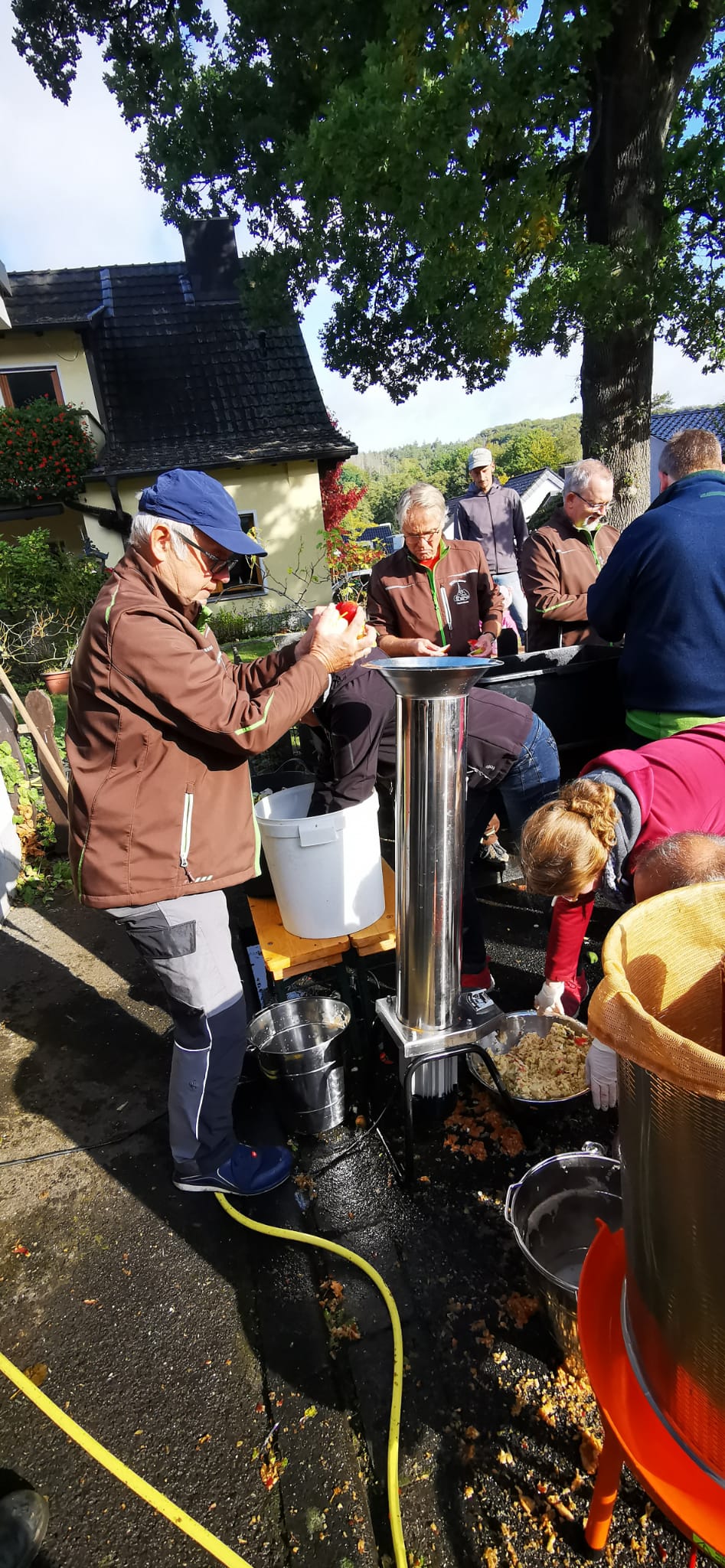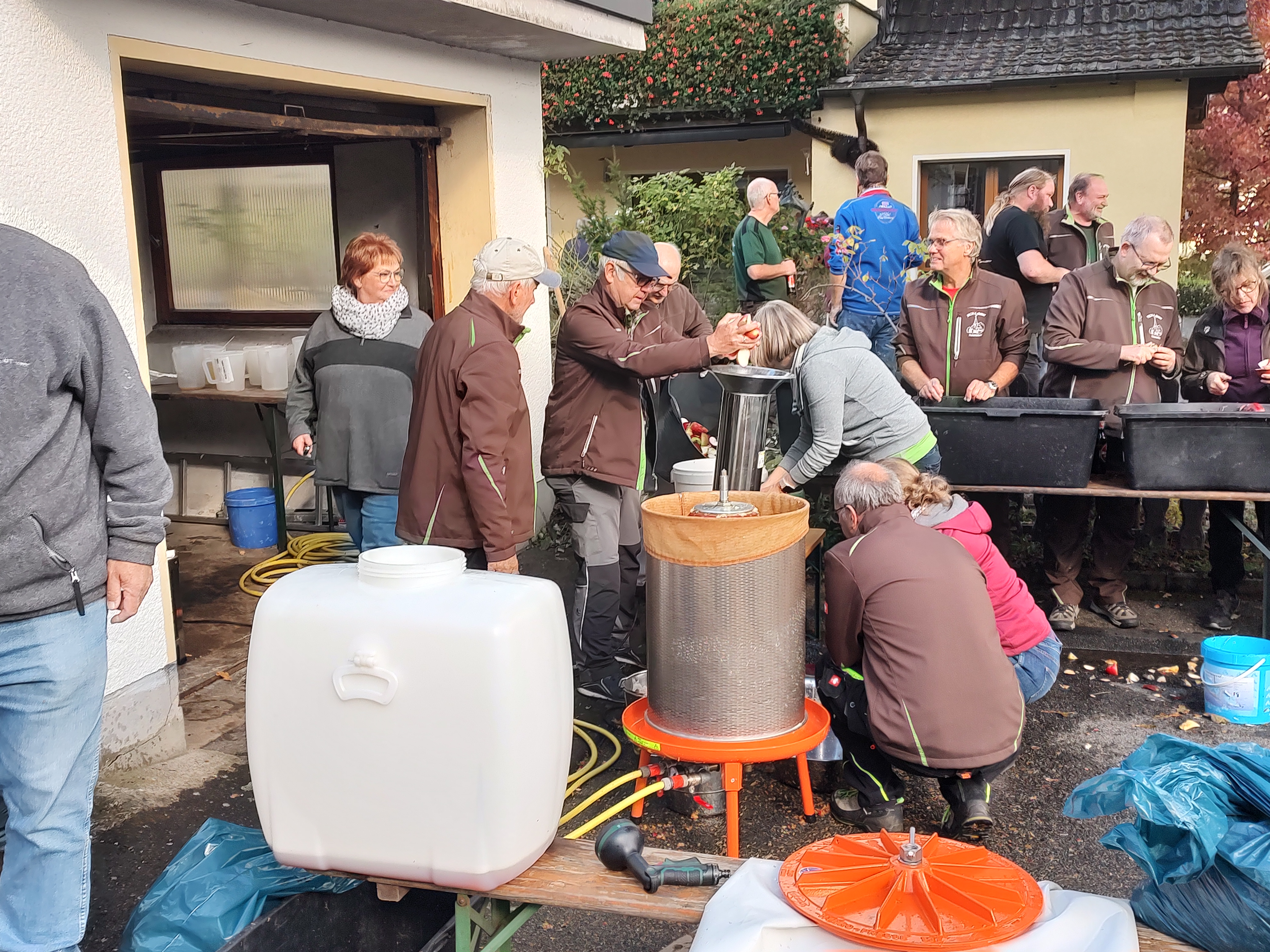 Die Vermostung fand am Folgetag statt. Mit 30 hoch motivierten und gut gelaunten Vereinsmitgliedern wurden die Äpfel zerteilt, gewaschen, gepresst, pasteurisiert und in fünf Literschläuchen abgefüllt. Dabei waren die Äpfel der Obstplantage ideal zur Vermostung. Das Ergebnis: 370 Liter Apfelsaft bester Qualität, wie man ihn mit hochgezüchteten Handelssorten niemals erreichen kann. Ein Teil des Apfelsaftes wird auf dem diesjährigen Weihnachtsmarkt im Dezember an der katholischen Kirche, auf dem der HGV einen Stand hat, Verwendung finden.