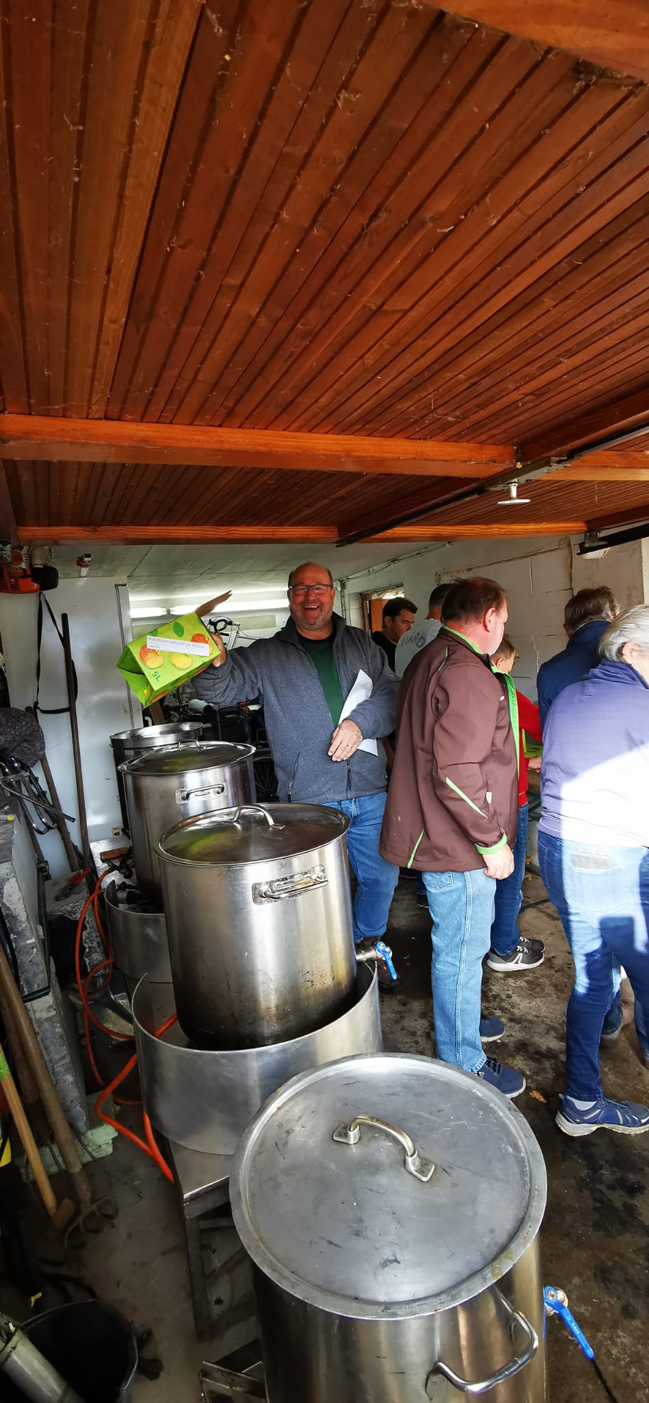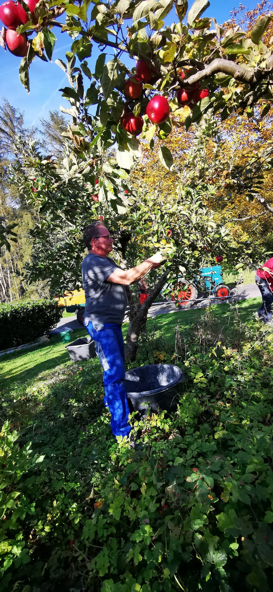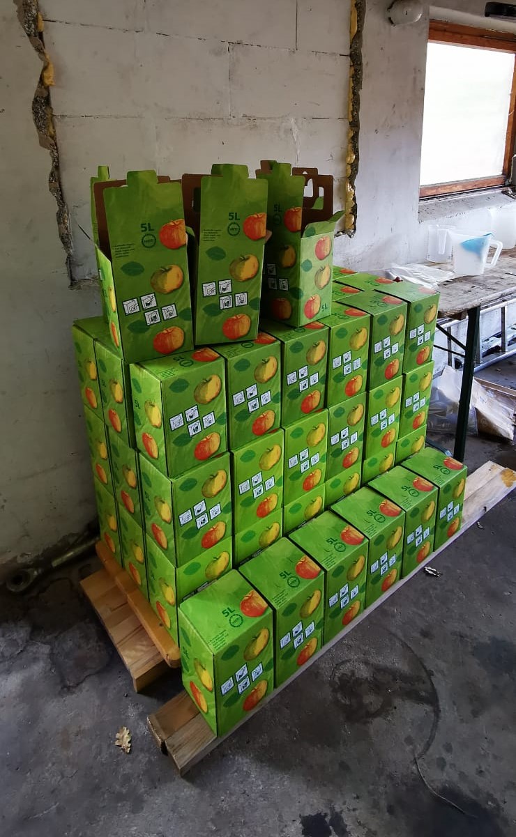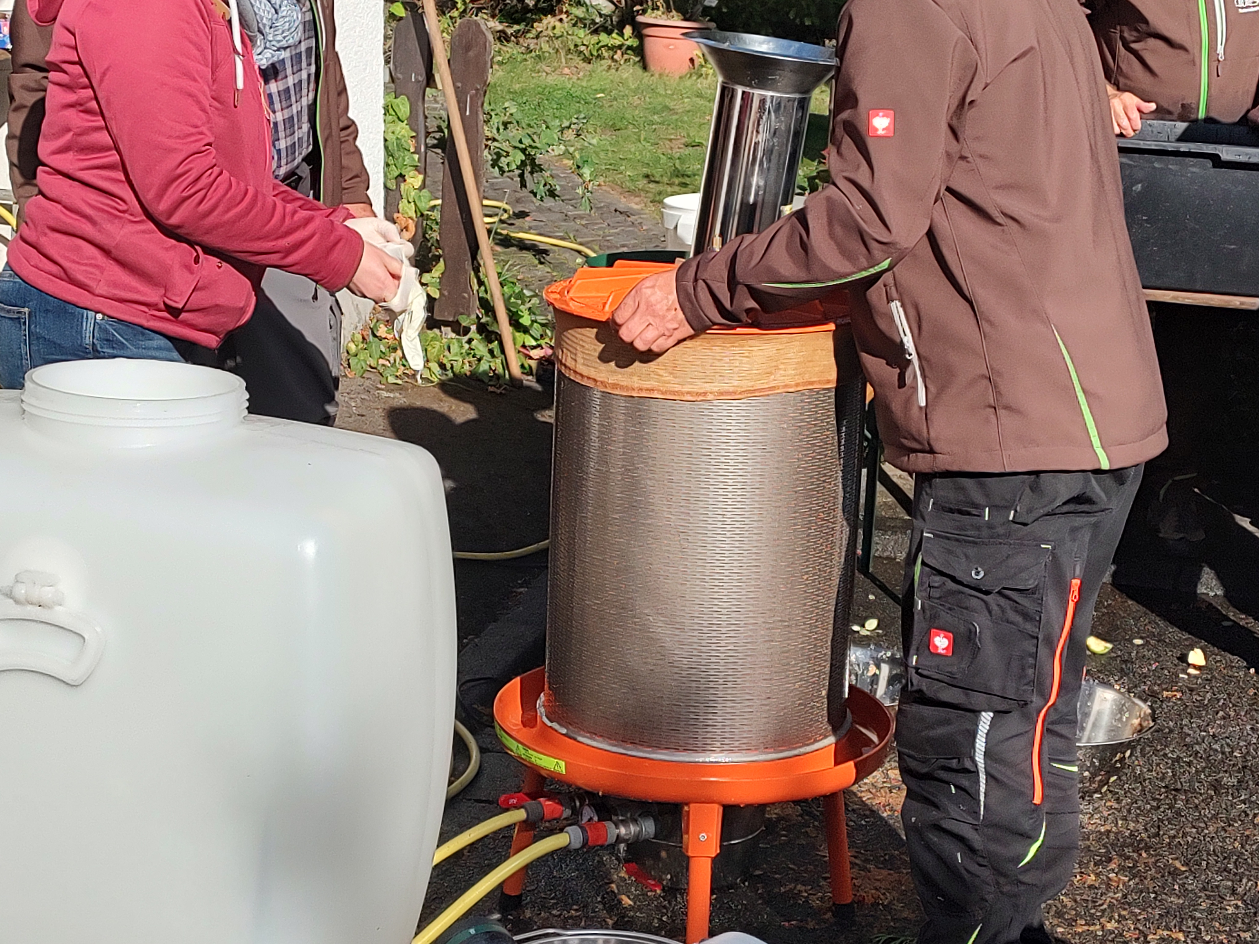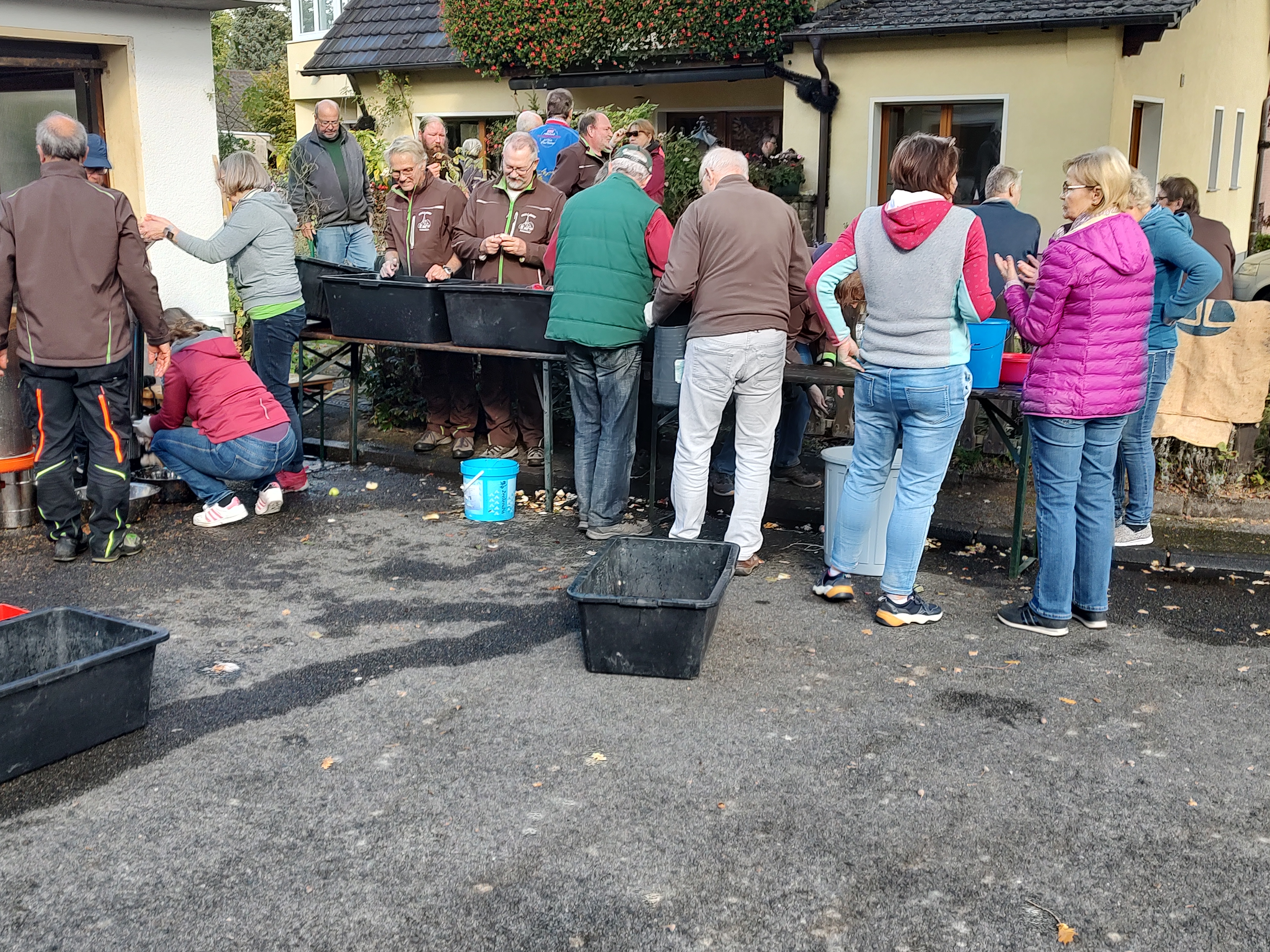 Die Vermostung fand am Folgetag statt. Mit 30 hoch motivierten und gut gelaunten Vereinsmitgliedern wurden die Äpfel zerteilt, gewaschen, gepresst, pasteurisiert und in fünf Literschläuchen abgefüllt. Dabei waren die Äpfel der Obstplantage ideal zur Vermostung. Das Ergebnis: 370 Liter Apfelsaft bester Qualität, wie man ihn mit hochgezüchteten Handelssorten niemals erreichen kann. Ein Teil des Apfelsaftes wird auf dem diesjährigen Weihnachtsmarkt im Dezember an der katholischen Kirche, auf dem der HGV einen Stand hat, Verwendung finden.