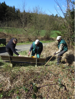 Aktive des Fachbereichs Naturschutz bei der Pflege einer Bank