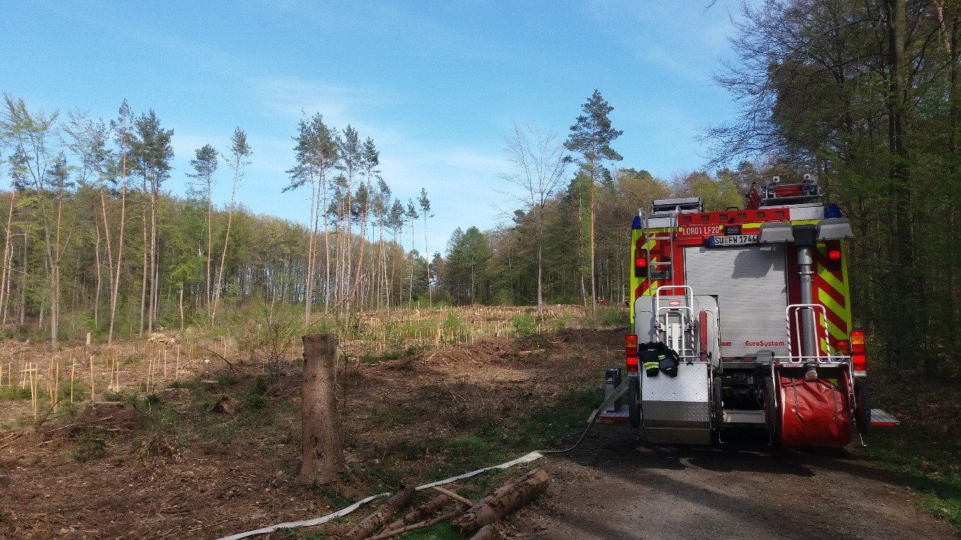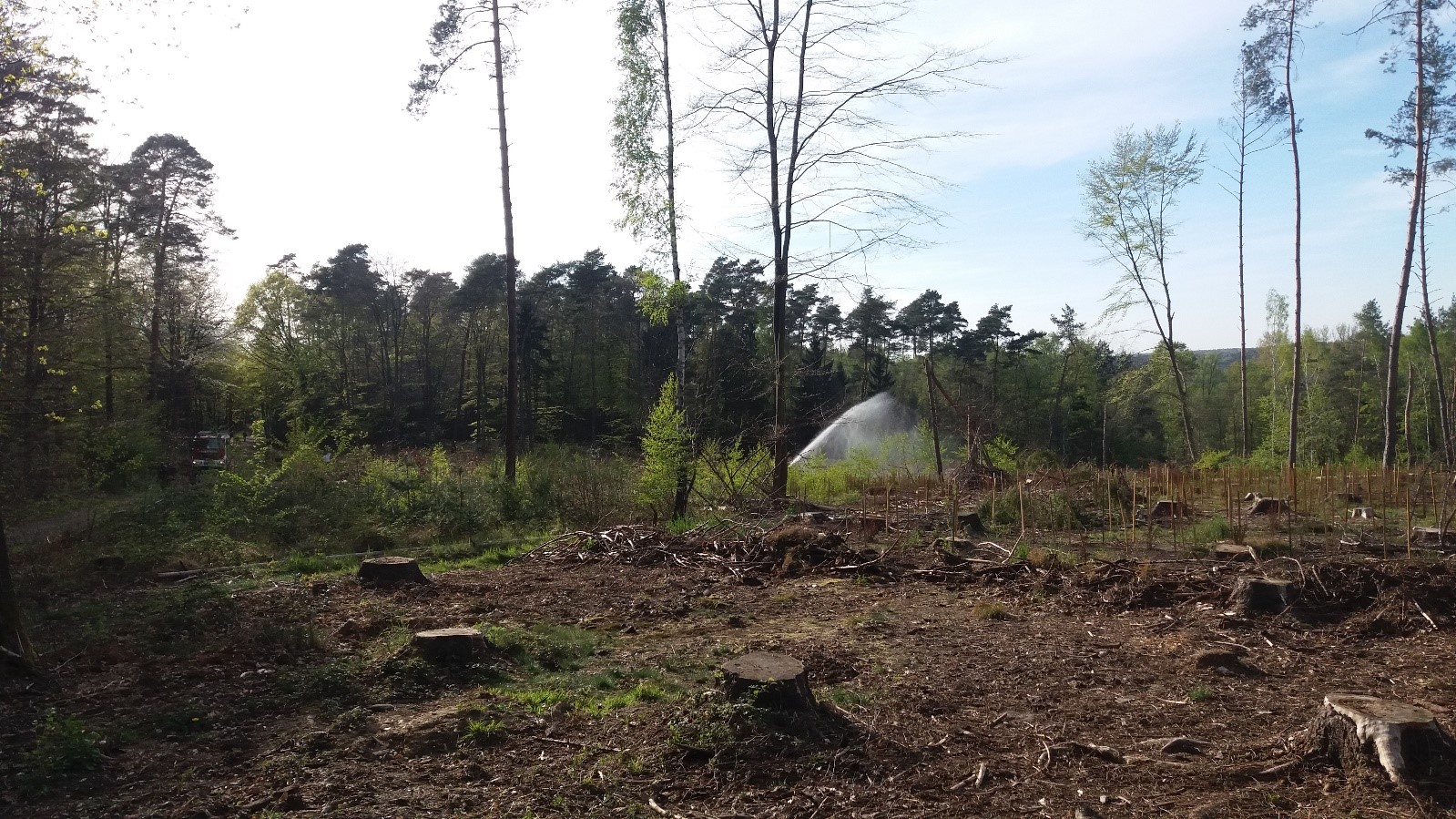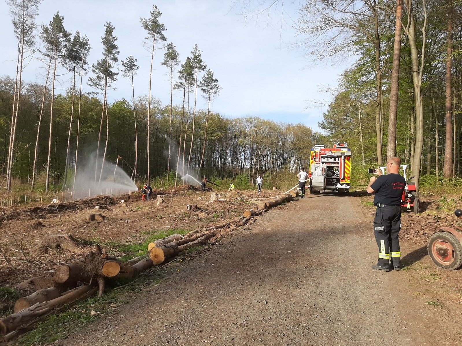 Die 1700 Pflanzen sind ganz überwiegend nach den Pflanztagen gut angegangen und zeigen ihr Blattwerk in den schönsten Grüntönen. Verschiedene Sorten brauchen aber auch noch etwas Zeit. Seit dem letzten Pflanztag sind bis Ostern vier Wochen vergangen und an keinem Tag hat es geregnet. Da war es wirklich gut, dass der Februar deutlich zu viel Regen mitgebracht hatte und es nach jedem – außer dem letzten Pflanztag immer reichlich Nachschub gegeben hat. Die kleine Schauer vom Ostermontag hat noch nicht einmal dafür gesorgt, dass es nicht gleich staubt, wenn man im Wald unterwegs ist. So war es höchste Zeit, über eine zusätzliche Bewässerung der noch jungen Pflanzen nachzudenken. Für diesen Fall hatten wir eigentlich geplant, ein großes Güllefass mit Wasser zu füllen, daraus große Bütten zu befüllen und dann mit vielen Gießkannen und Helfern Wasser an die Pflanzen zu bringen. Wegen Corona war aber ein solcher Aufwand nicht möglich und nicht mehr der richtige Weg. Auf Nachfrage nach leistungsstarken Pumpen bei verschiedenen Stellen zeigte sich dann schnell, dass auch der Aufwand mit Stromerzeuger und Pumpe schon einige Kräfte bindet. Die Lösung: LF der Feuerwehr und kleines Team! Herzlichen Dank – 16.000 Liter in knapp drei Stunden mit einem minimalen Personaleinsatz und natürlich reichlich Abstand. Die Pflanzen haben jetzt wieder ausreichend Wasser bis zum hoffentlich nächsten Regen. Danke auch an die Stadtwerke – diese haben uns unkompliziert die kostenlose Entnahme des Wassers aus dem Hydranten gestattet.Die Anlegung des Blühstreifens verzögert sich wegen der trockenen Witterung auch noch etwas. Der bereits aufgebrachte Kalk muss mit dem ersten längeren Regen erst noch in den Boden eindringen.