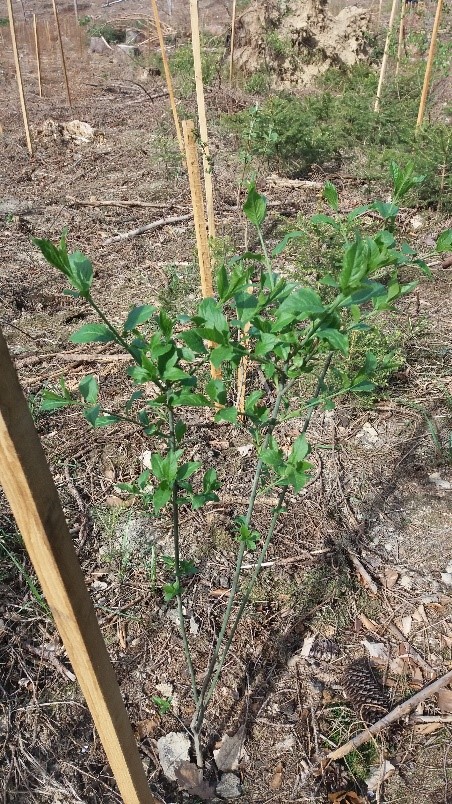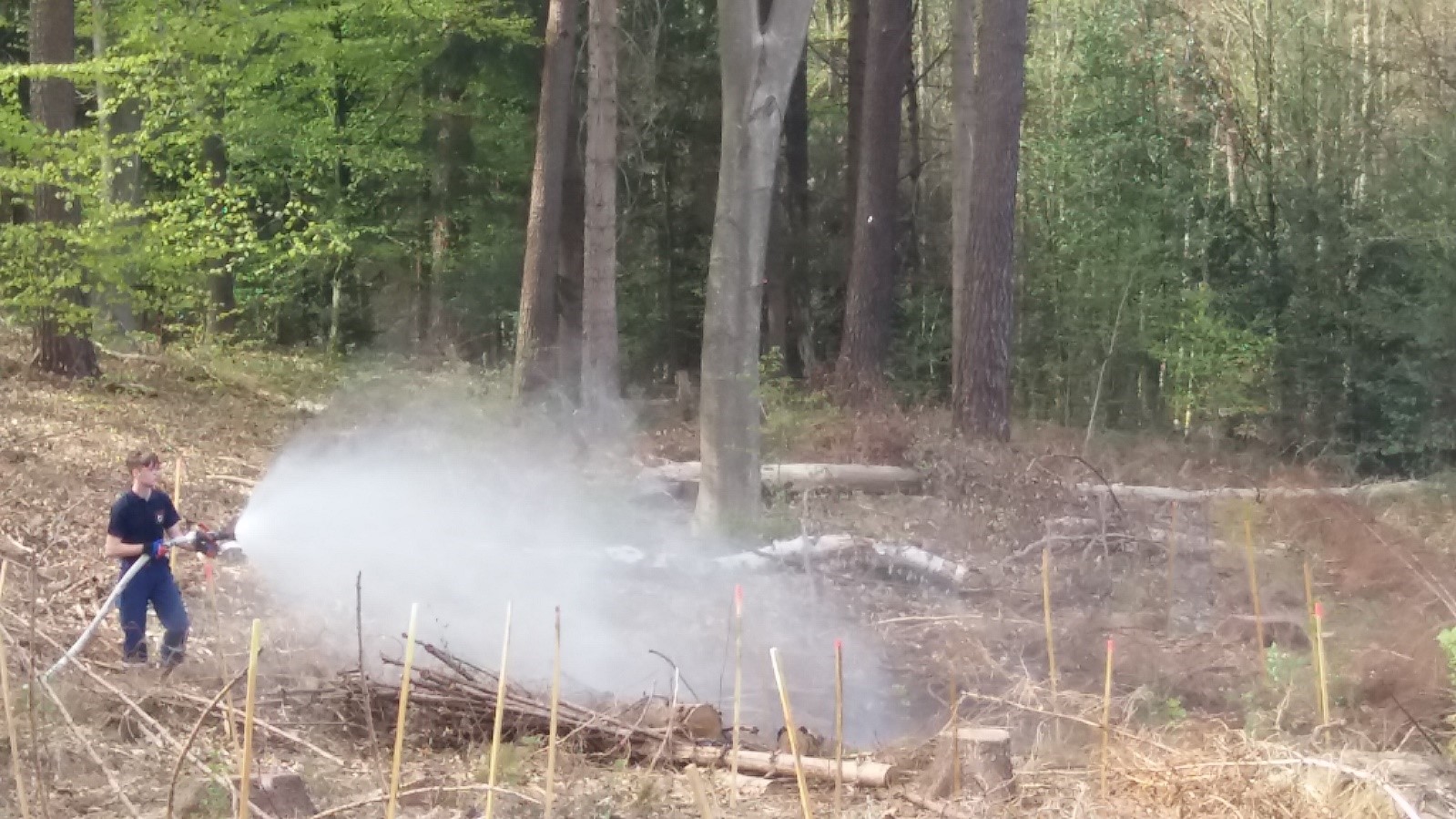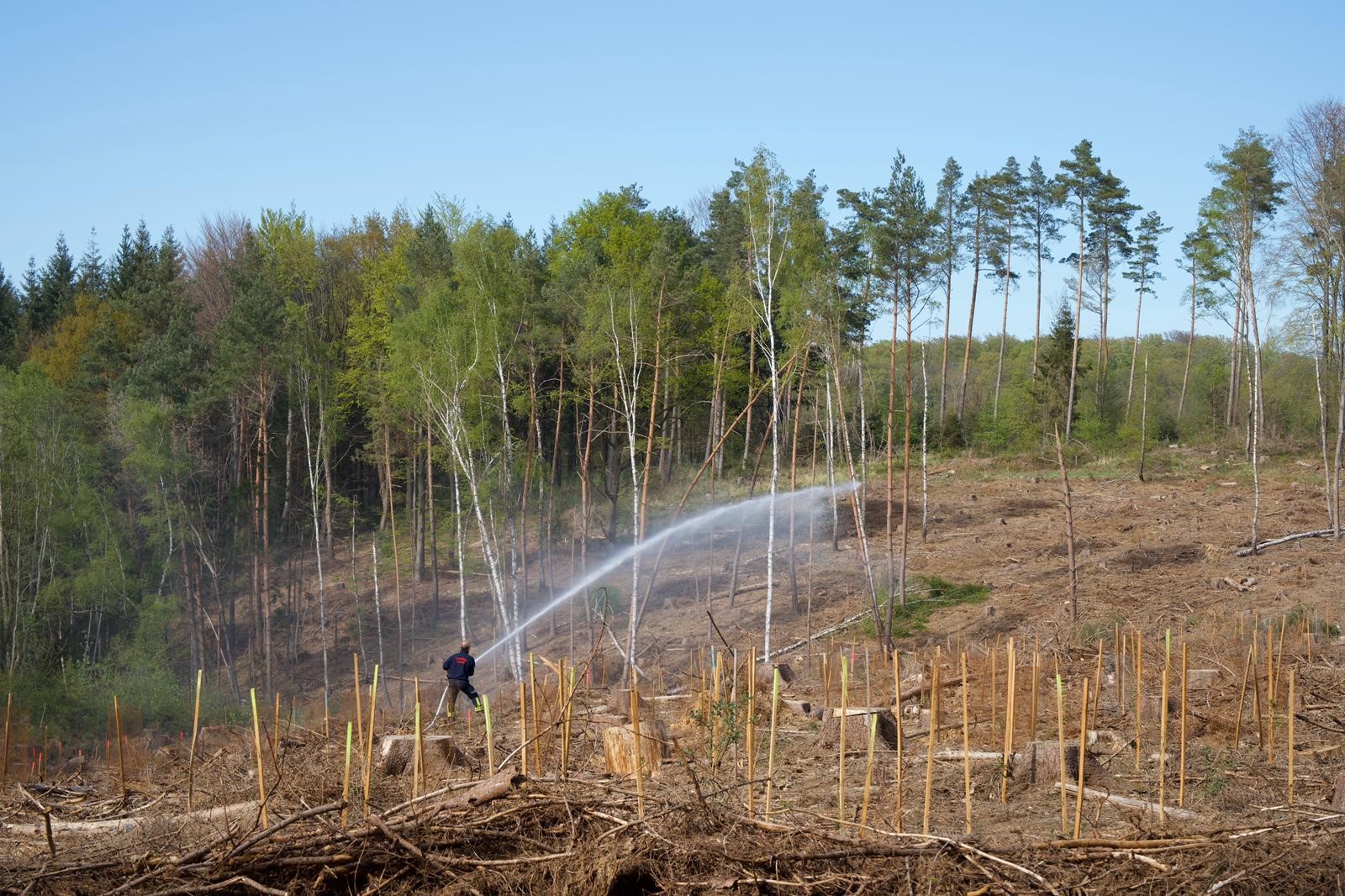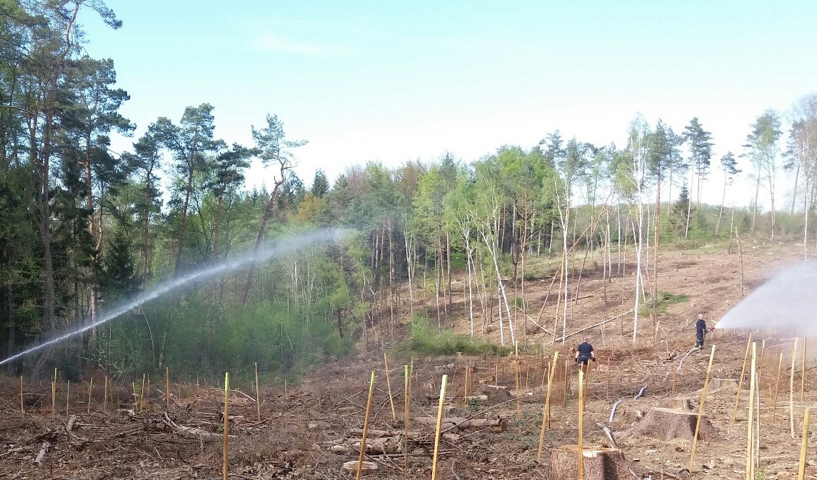 Die 1700 Pflanzen sind ganz überwiegend nach den Pflanztagen gut angegangen und zeigen ihr Blattwerk in den schönsten Grüntönen. Verschiedene Sorten brauchen aber auch noch etwas Zeit. Seit dem letzten Pflanztag sind bis Ostern vier Wochen vergangen und an keinem Tag hat es geregnet. Da war es wirklich gut, dass der Februar deutlich zu viel Regen mitgebracht hatte und es nach jedem – außer dem letzten Pflanztag immer reichlich Nachschub gegeben hat. Die kleine Schauer vom Ostermontag hat noch nicht einmal dafür gesorgt, dass es nicht gleich staubt, wenn man im Wald unterwegs ist. So war es höchste Zeit, über eine zusätzliche Bewässerung der noch jungen Pflanzen nachzudenken. Für diesen Fall hatten wir eigentlich geplant, ein großes Güllefass mit Wasser zu füllen, daraus große Bütten zu befüllen und dann mit vielen Gießkannen und Helfern Wasser an die Pflanzen zu bringen. Wegen Corona war aber ein solcher Aufwand nicht möglich und nicht mehr der richtige Weg. Auf Nachfrage nach leistungsstarken Pumpen bei verschiedenen Stellen zeigte sich dann schnell, dass auch der Aufwand mit Stromerzeuger und Pumpe schon einige Kräfte bindet. Die Lösung: LF der Feuerwehr und kleines Team! Herzlichen Dank – 16.000 Liter in knapp drei Stunden mit einem minimalen Personaleinsatz und natürlich reichlich Abstand. Die Pflanzen haben jetzt wieder ausreichend Wasser bis zum hoffentlich nächsten Regen. Danke auch an die Stadtwerke – diese haben uns unkompliziert die kostenlose Entnahme des Wassers aus dem Hydranten gestattet.Die Anlegung des Blühstreifens verzögert sich wegen der trockenen Witterung auch noch etwas. Der bereits aufgebrachte Kalk muss mit dem ersten längeren Regen erst noch in den Boden eindringen.