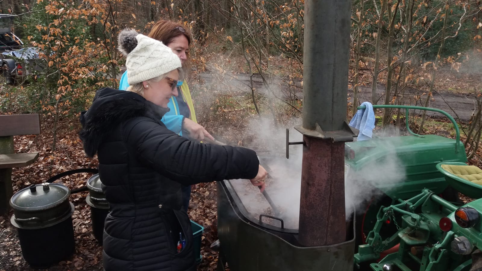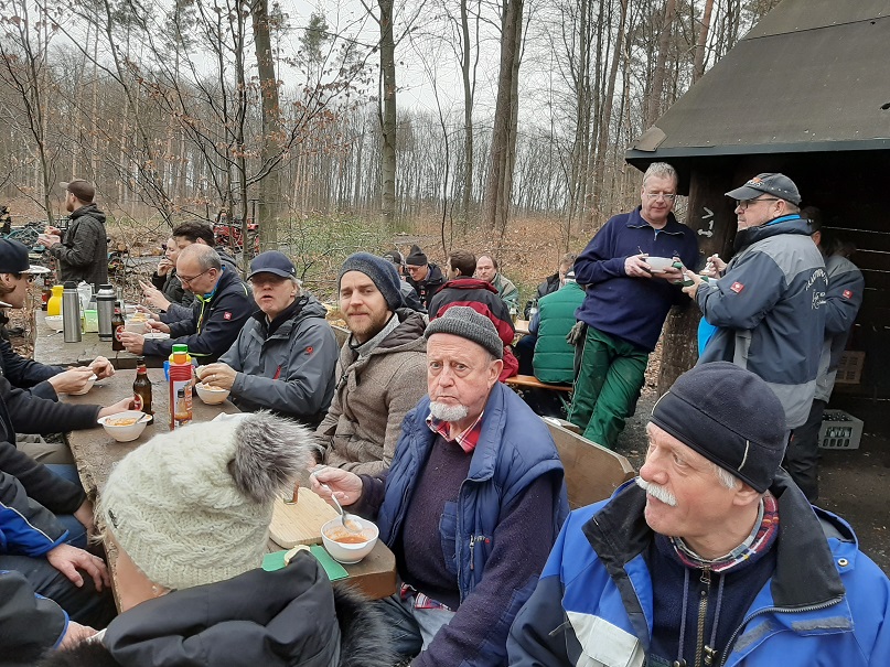 Insgesamt 45 Helfer stehen pünktlich an der Schutzhütte zum Einsatz zur Verfügung. Darunter acht Kinder und sieben Frauen der HGV-Gruppe. Sie haben für die ausreichenden Getränkevorräte und auch für das Mittagessen gesorgt. Es wird an der Schutzhütte frisch in der Feldküche eines Mitgliedes der Traktorfreunde gekocht. Es ist sicher eine gewisse Herausforderung, auf offenem Feuer und in dieser Menge zu kochen. Pünktlich um 12 Uhr stand alternativ die Siedewurst im Brötchen und das Chilli Con Carne auf den Tischen der Schutzhütte und zusätzlichen Bierzeltgarnituren. Supergut und Lecker war das einhellige Urteil auch der Gäste und der Pressevertreter. Eigens für diesen Tag und zukünftige Aktionen zur Müllvermeidung angeschafftes Geschirr kommt erstmals zum Einsatz.