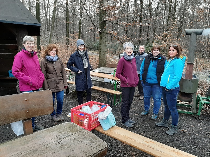 Bei Temperaturen um die 12 Grad und trockener Witterung kommt diese genussvolle Pause jetzt allen Recht. Vor dem Essen Hände waschen nicht vergessen: Wasser aus Kanistern, biologisch abbaubar Seife und sogar Handtücher stehen bereit. Zeit zur Stärkung, Erholung, Austausch – mitten im Wald- man sieht was erreicht wurde und genießt!