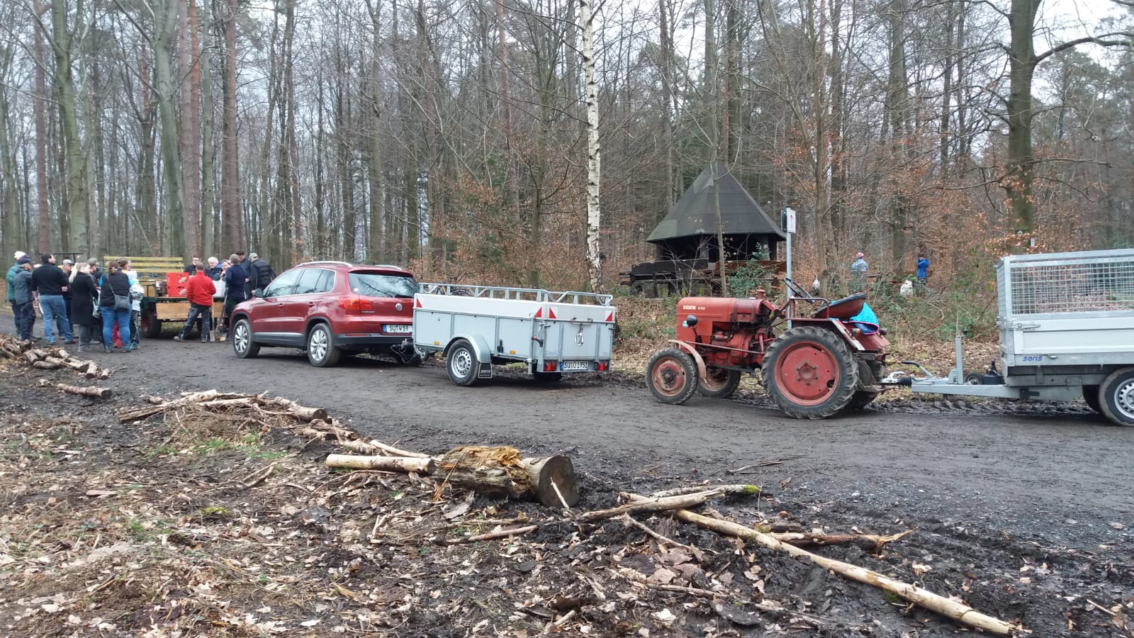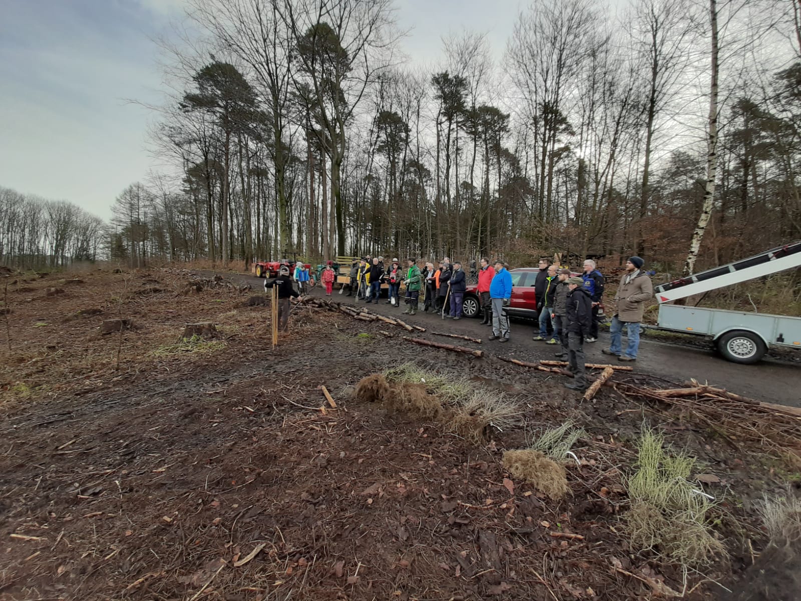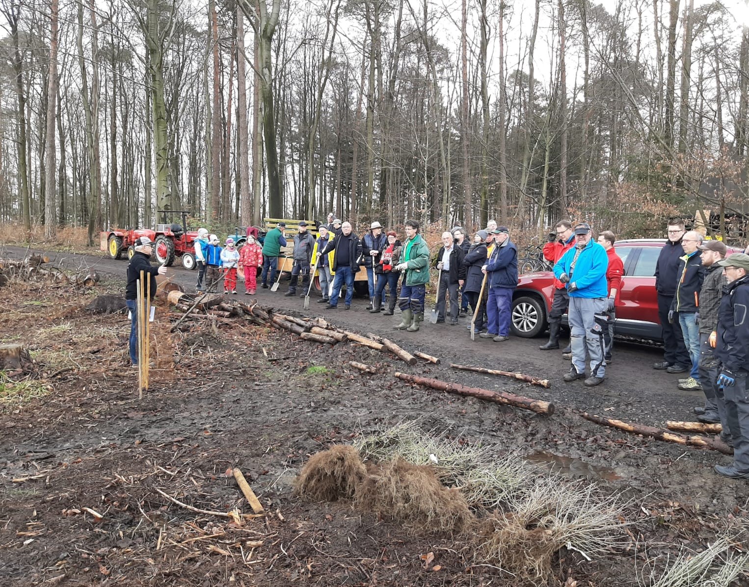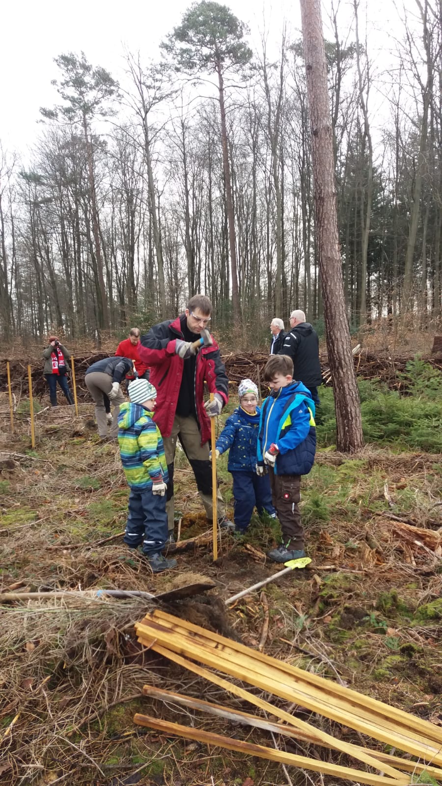 Fachkundig erklärt Wolfgang den Kindern und Helfern zum Start in den Tag das gesamte Projekt und die notwendigen einzelnen Arbeitsschritte. Zunächst werden nur Sträucher in dem dafür markierten Bereich gepflanzt. Gruppen von etwa 4 bis 5 Personen bekommen zunächst neun verschiedene Sträucher, die entsprechende Anzahl an Pflanzstäben, Spaten und Fäustel und schon geht es an die Arbeit des Pflanzens. Zeitgleich beginnt die Produktion der Drahtreusen. Nach kurzer Einarbeitung verlässt in einer Zeit unter einer Minute jeweils eine Reuse fertig am Pflanzstab unseren mobilen Arbeitsplatz auf dem Traktoranhänger. Nach entsprechendem Vorlauf können also jetzt die Bäume gepflanzt werden, denn nur diese bekommen den Schutz gegen Wildverbiss von uns. Inzwischen sind hier ausreichend Bündel mit jeweils acht verschiedenen Baumarten zusammengestellt worden, der zweite Schenkel des Waldgrundstücks ist für den Strauchriegel und den Baumstreifen markiert und alle Arbeiten laufen jetzt Hand in Hand. Dabei ist ausreichend Zeit für kleinere Pausen bei Kaffee, Apfelschorle oder Wasser. Viele Fotos vom Projekt entstehen und die örtliche Presse interessiert sich vor Ort für unser Projekt. Viele Waldbesucher erkundigen sich heute ebenfalls bei uns. Bis zur Mittagspause werden etwa 350 Pflanzen gesetzt.