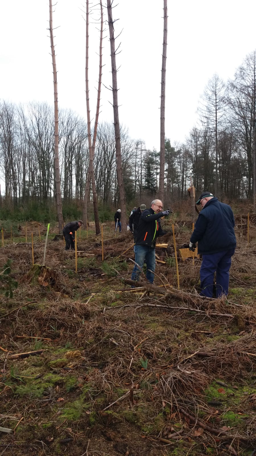 Angekündigter Sturm und Regen lassen die Pause nicht zu lange ausfallen. Nun geht es den zweiten Teil – weitere 150 Bäume sollen noch gepflanzt werden, restliche Pflanzen für die nächsten Aktionstage mit Vereinen, Schulen, dem Kath. Kindergarten und Sponsoren werden „eingeschlagen" und erste Aufräumarbeiten beginnen.