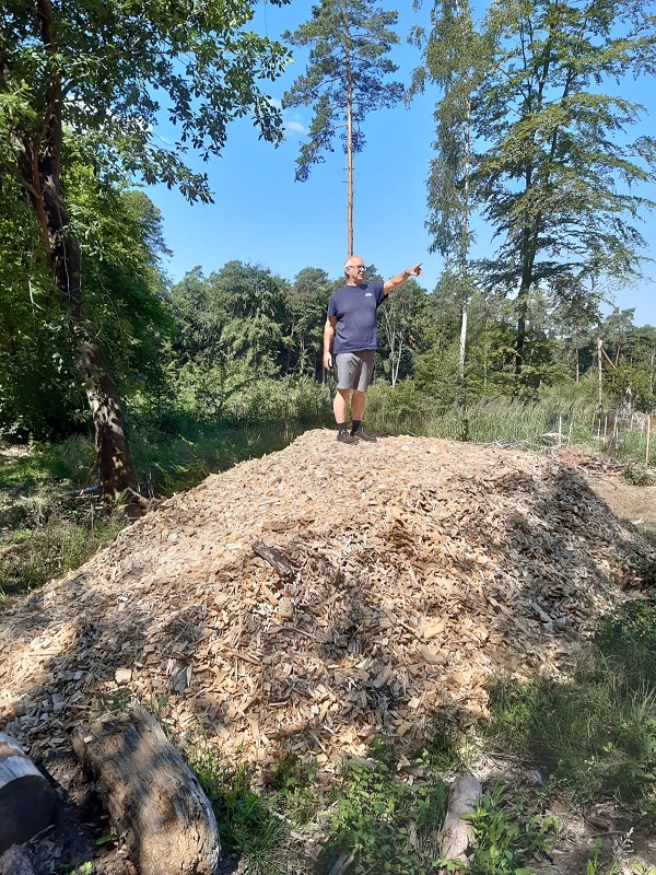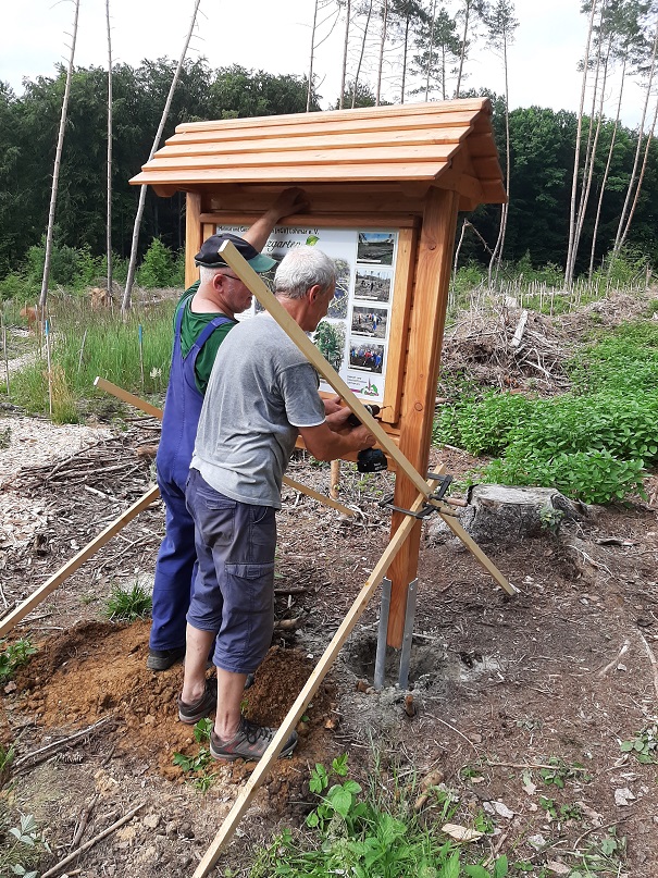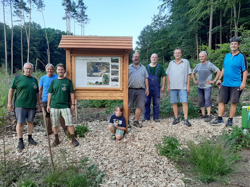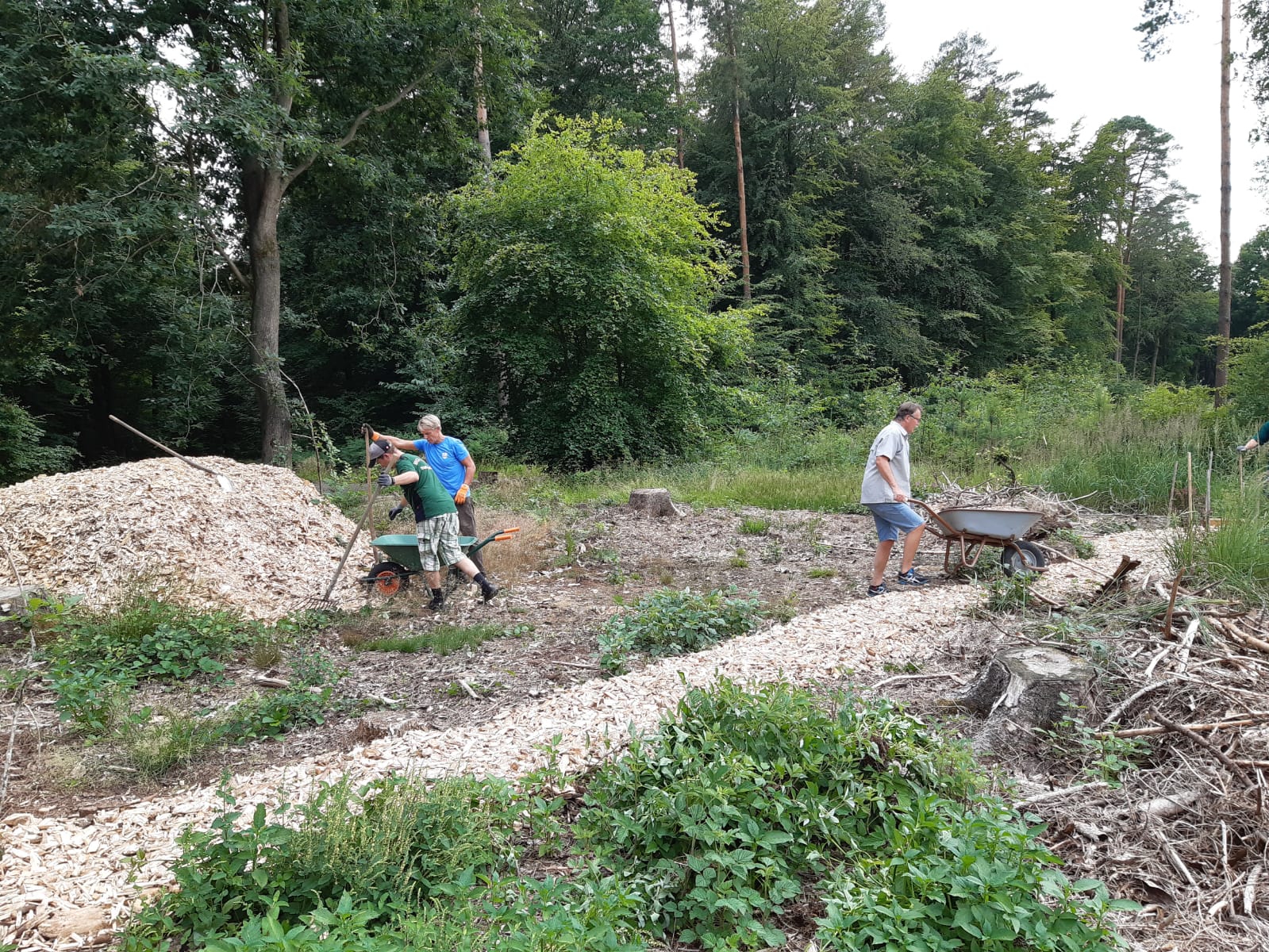 Neu aufgestellt wurde jetzt eine Infotafel mit zwei Schaubildern im Baumpflanzgarten, die über das Projekt, seine Umsetzung, die verwendeten Pflanzen aber über den Klimawandel und die Forstwirtschaft informiert. Neu angelegt wurde auch ein etwa 200 Meter langer Waldlehrpfad durch die neuen Anpflanzungen. Hierzu wurden von zehn aktiven Mitgliedern der Naturschutzgruppe unter Leitung von Wolfgang Weber etwa 20 Kubikmeter Hackschnitzel für die Wegeführung aufgebracht – bei Temperaturen von 30 Grad eine schweißtreibende aber lohnende Arbeit. Später folgen soll noch eine Beschilderung der Strauch- und Baumarten im Bereich des Lehrpfades und die Aufstellung einer Insekten Bobachtungsstation.