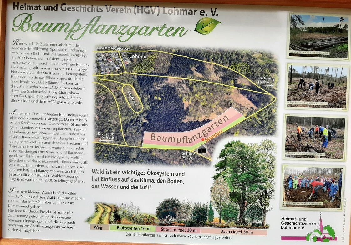„Baumpflanzgarten“ nennt der Heimat und Geschichtsverein Lohmar die Fläche an der Schutzhütte, an der in diesem Frühjahr mit viel körperlicher aber auch finanzieller Unterstützung aus der Bevölkerung bislang 1.700 Sträucher und Bäume gepflanzt wurden. Zu rund 95% sind die Pflanzen gut angewachsen und haben schon beachtliche Wachstumshöhe erreicht und dies obwohl unmittelbar nach der Pflanzaktion rund fünf Wochen kein Regen mehr gefallen war. Hilfreich war hier besonders eine Bewässerung mit 16.000 Litern Wasser durch die Freiwillige Feuerwehr. Einzig der Blühstreifen am Wegesrand lässt sich witterungsbedingt noch etwas Zeit in seiner Entwicklung.