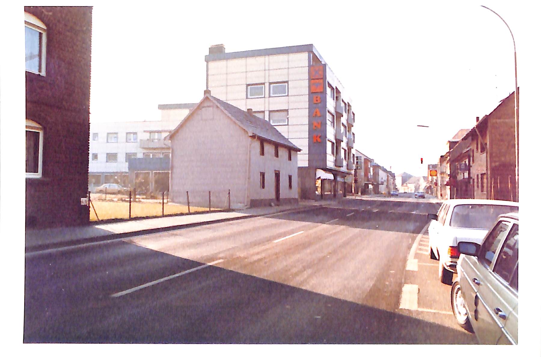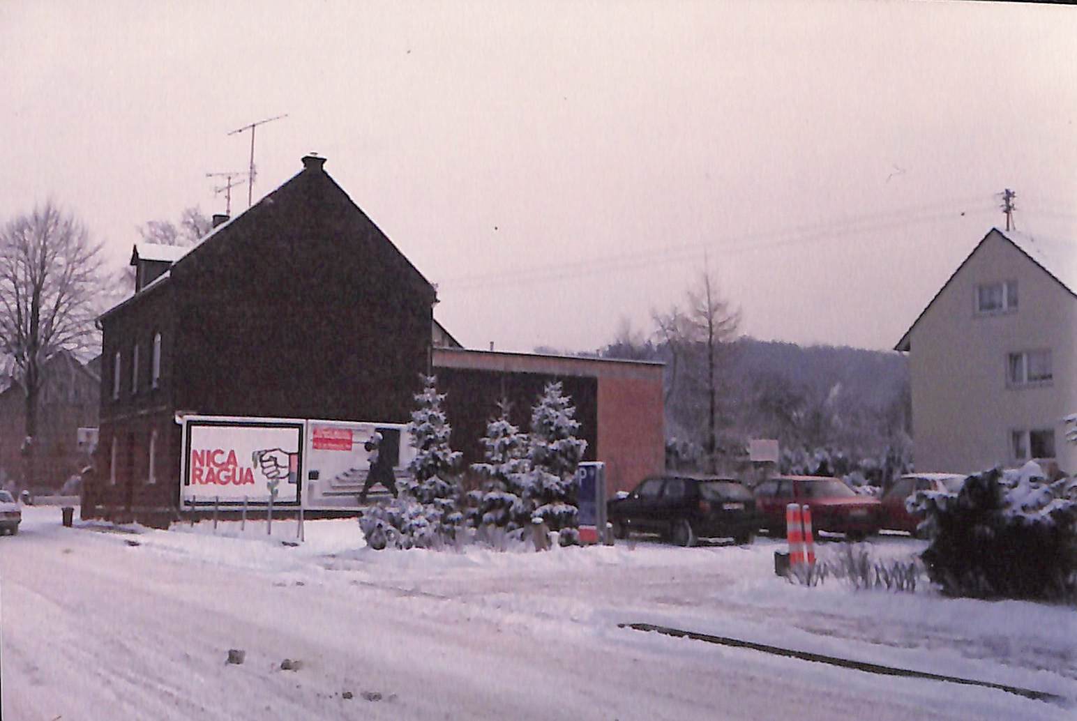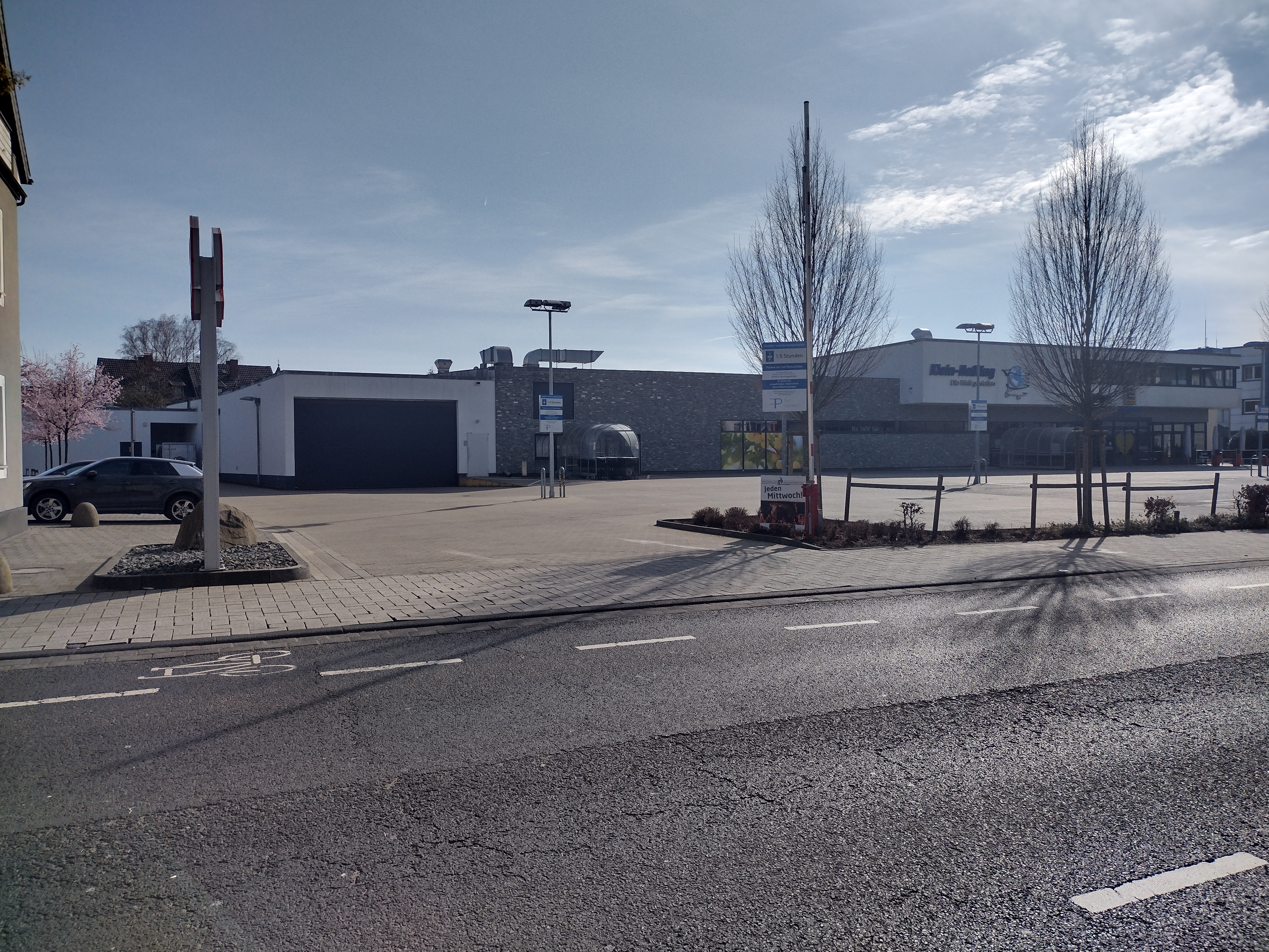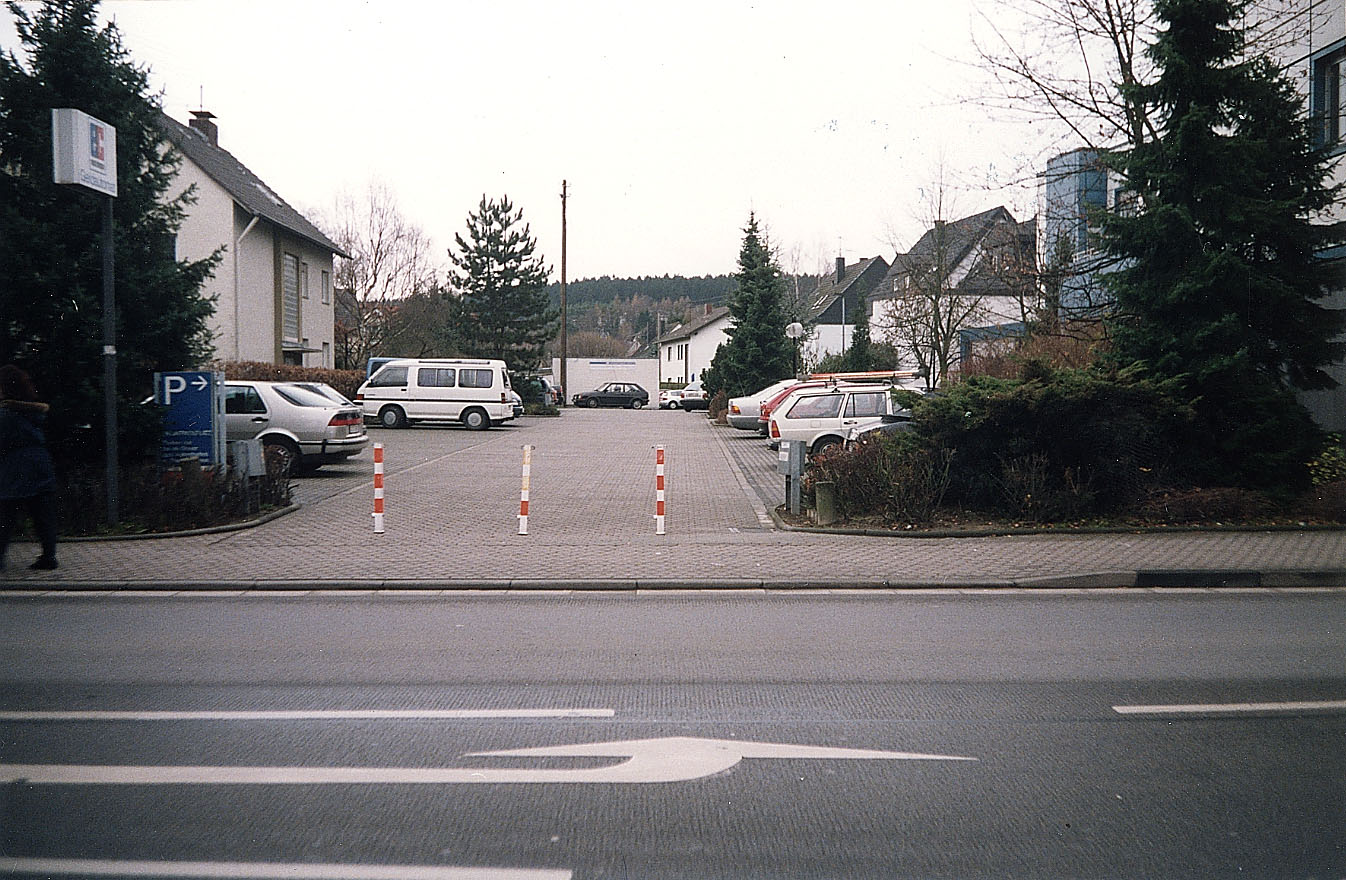 heutige Einfahrt zum EDEKA-Markt, rechts im Bild Gebäuder der VR-Bank