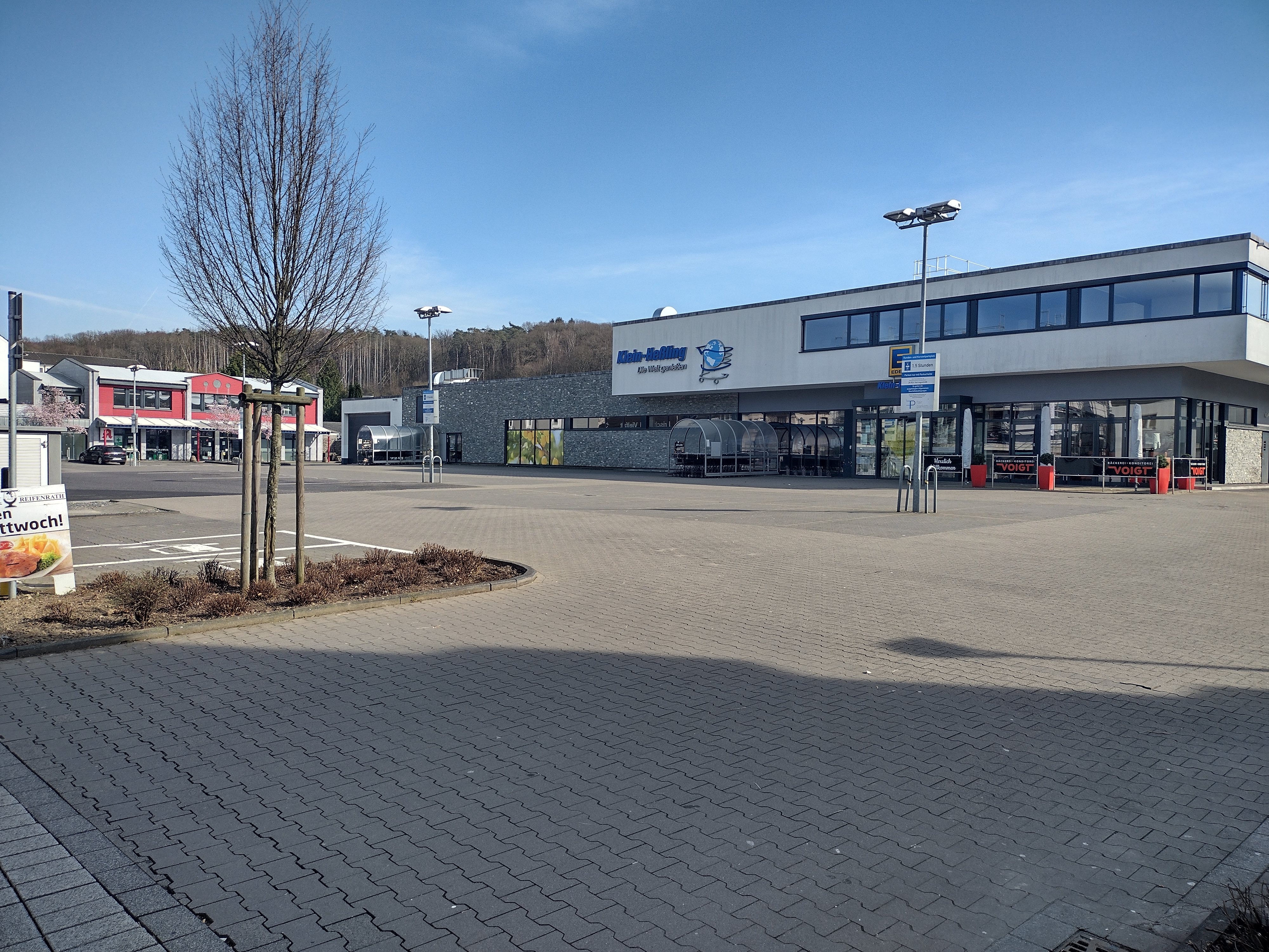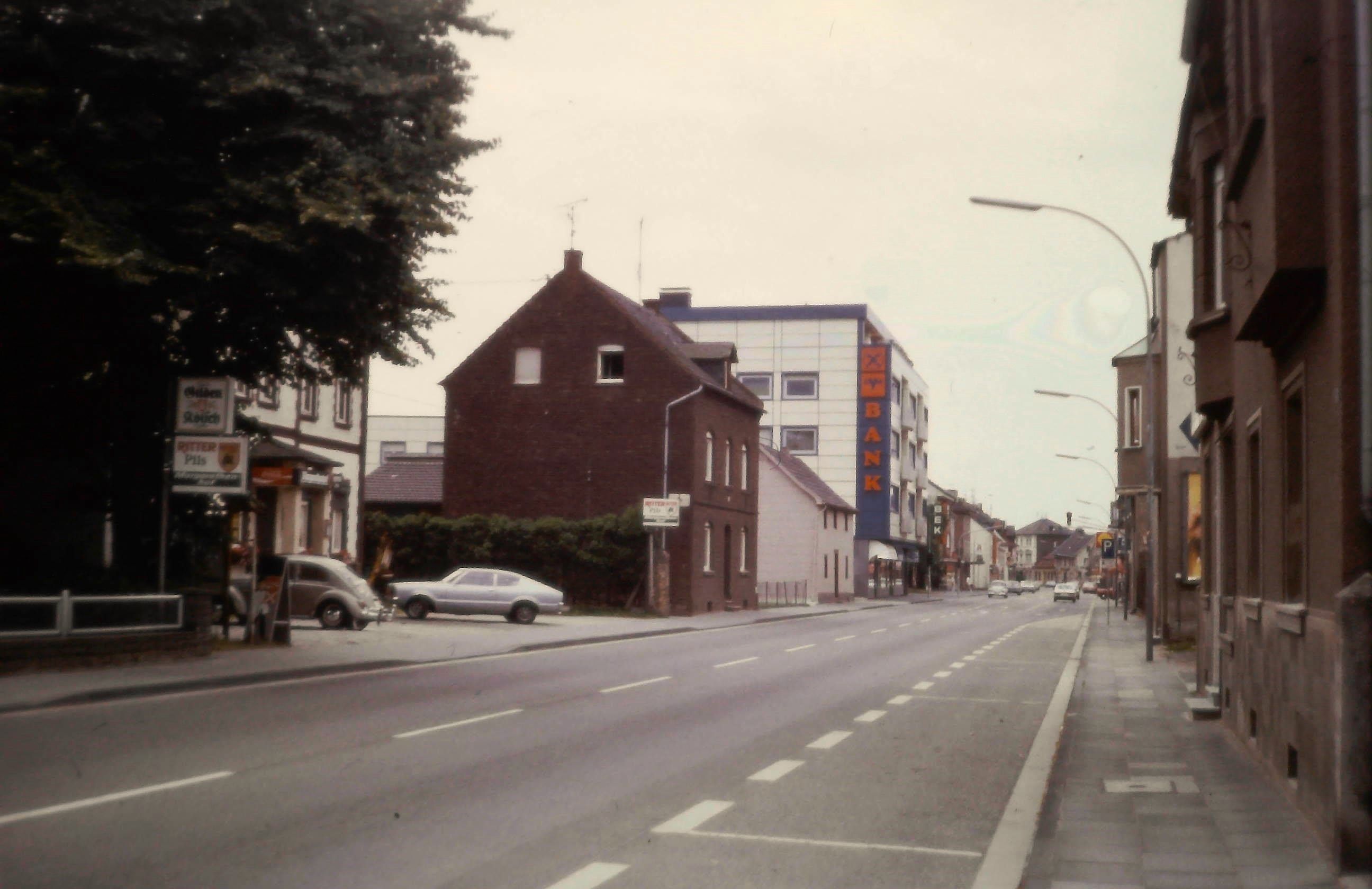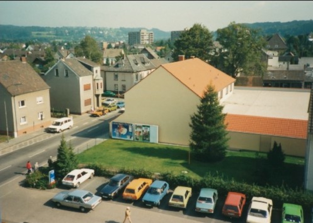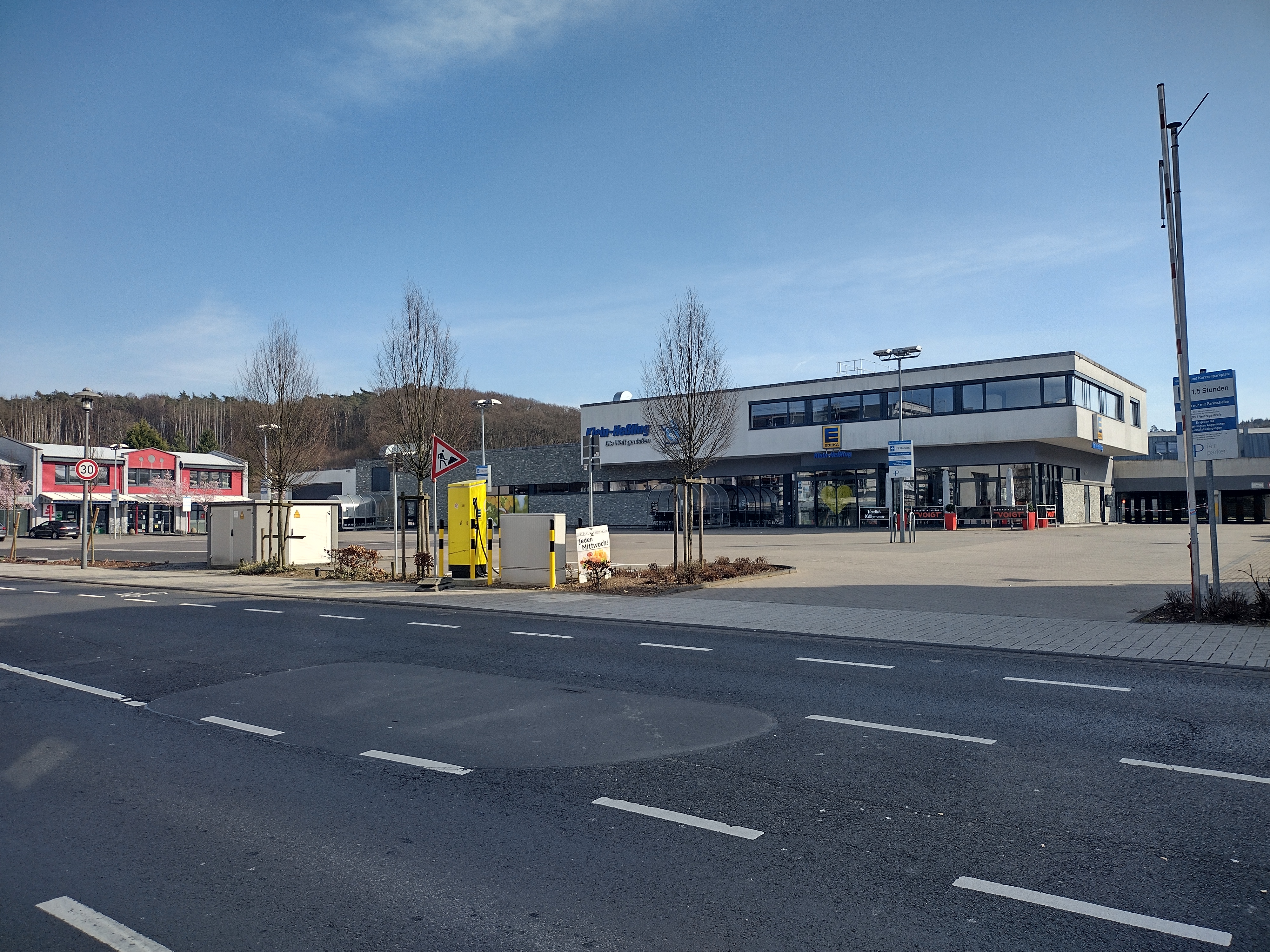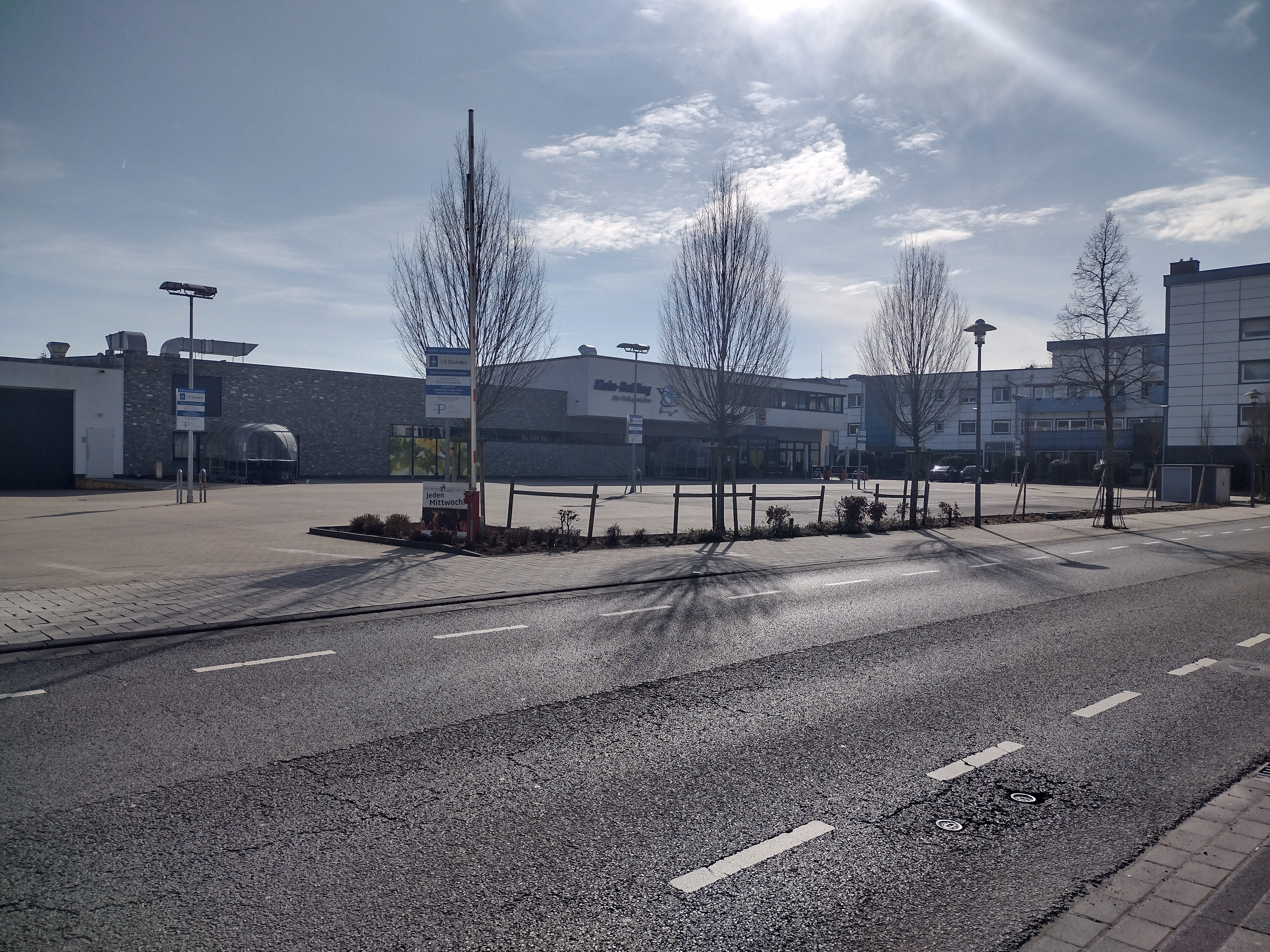 heutige Einfahrt zum EDEKA-Markt, rechts im Bild Gebäuder der VR-Bank