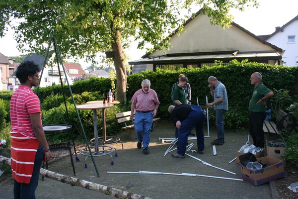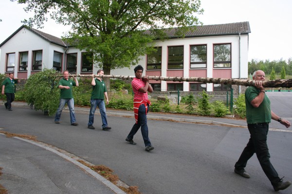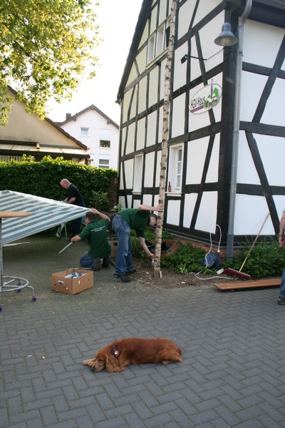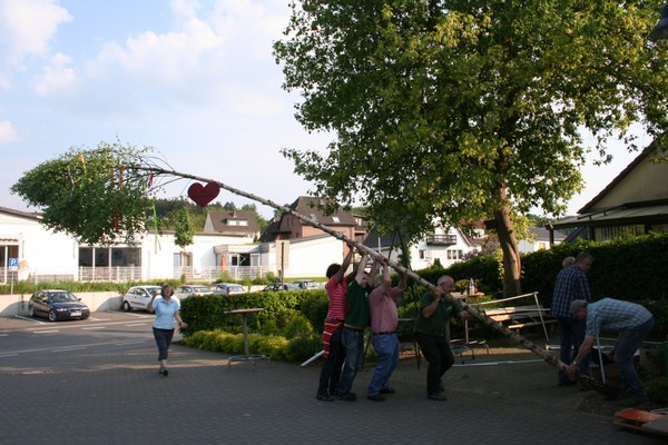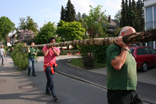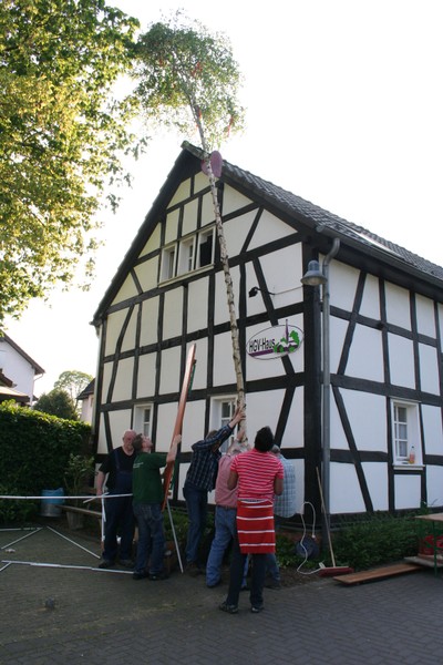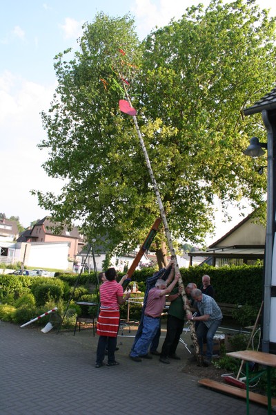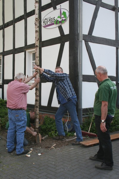 Zum zweiten mal setzte die Naturschutzgruppe des HGV-Lohmar einen Maibaum für die Dorfschönen am HGV-Haus auf. Früher hatten HGV-Mitglieder der Schmiedgasse (eine Hochburg der Naturschutzgruppe) einen Baum in ihrer Straße aufgestellt. Mit der Möglichkeit am HGV-Haus wurde dann der Ort verlagert und es kam auch ein größerer Personenkreis. Mit dem Förster wurde die Aktion Maibaumholen übrigens abgestimmt.
