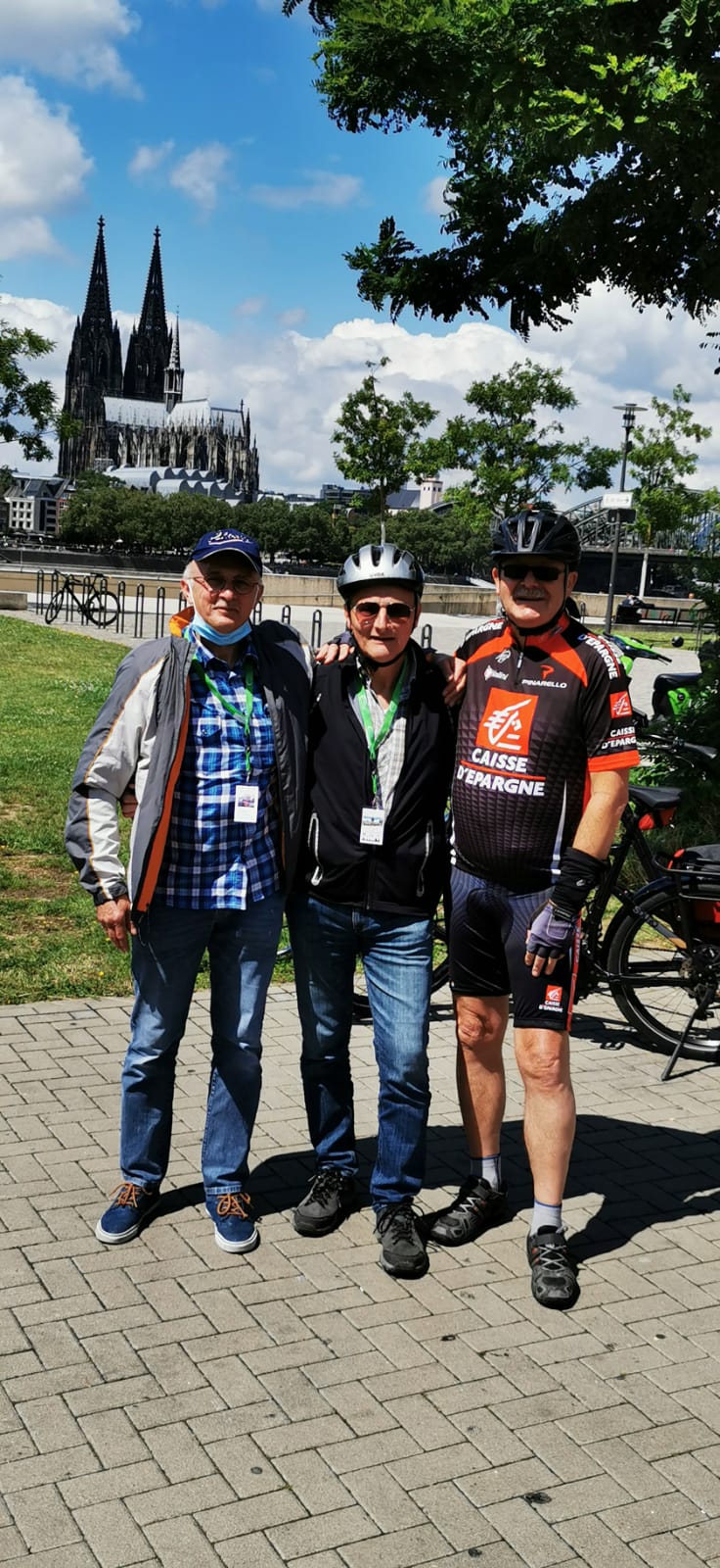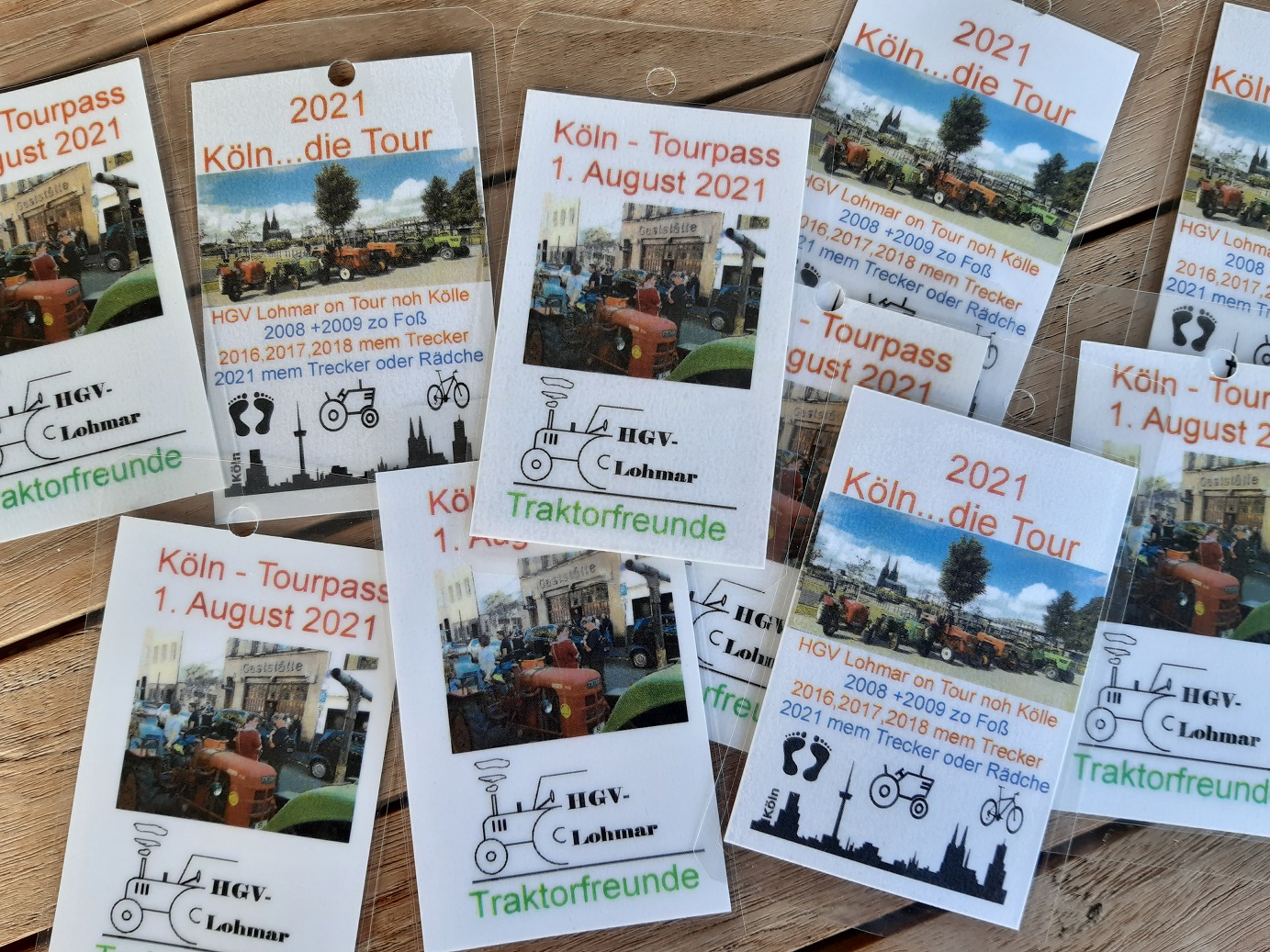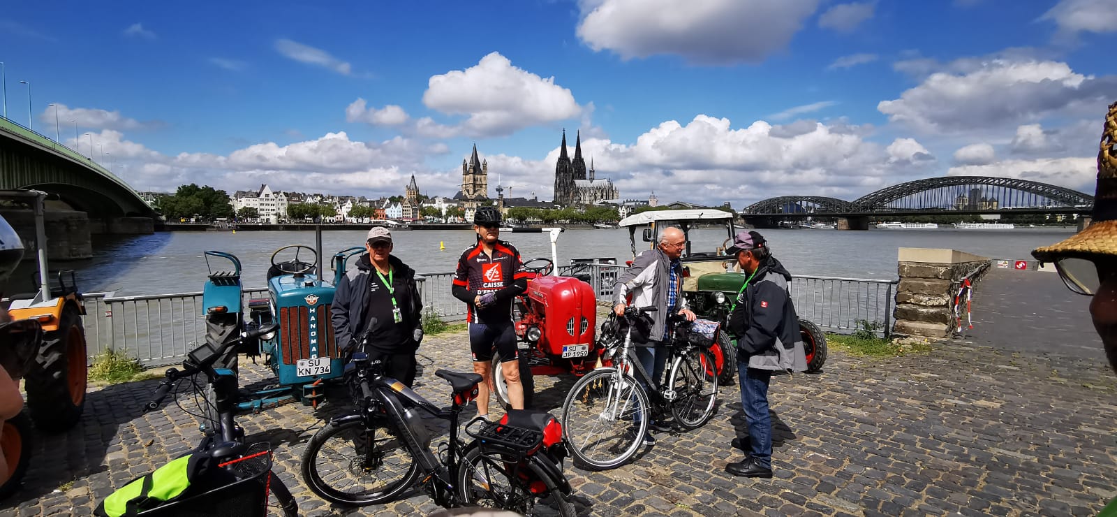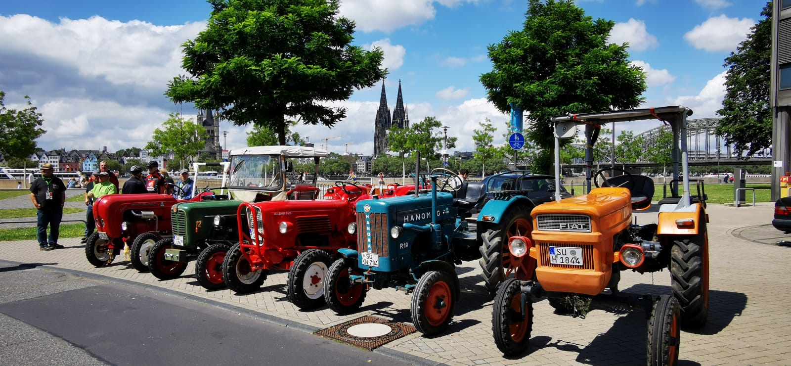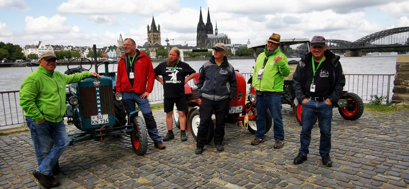 Pünktlich um acht Uhr trafen sich die Traktorfreude am HGV Haus mit den Beifahrern und nach kurzem Verzällcher wurde der Tourpass an das Halsband gehangen. Es wurde noch geunkt, damit sei heute alles umesüss. Schon kurz nach dem Start in der Wahnerheide begrüßte uns die Sonne und war den fast ganzen Tag bei milden Temperaturen für uns da. Die Fähre in Mondorf erreichten wir nach einer Stunde. In den hohen Maisfeldern vor Wesseling machten wir Pause. Etwa um diese Zeit trafen sich die drei Biker mit den Rädern am HGV Haus zur Abfahrt. Sie reisten mit nur einer Pause über die Groov nach Köln an. An der alten Liebe (Rodenkirchener Brücke) wurde noch mal gerastet, um dann die Kölner aus den „Häuschen zu holen“. Nahezu dreiviertel der Kölner die überhaupt schon wach waren ließ es sich nehmen, uns anerkennend den nach oben stehenden Daumen oder eine andere nette Geste zu zeigen, darunter auch etliche Autofahrer. Über die Deutzer Brücke – mal wieder das Erlebnis - und schon standen wir auf der anderen Rheinseite. Hier entstanden die ersten Fotos mit Domblick und hier war auch der Treffpunkt mit den Bikern – rund zwei Stunden waren sie unterwegs. Die doch sehr staubigen Wege nach Köln führten uns dann schnell zum zweiten gemeinsamen Ziel, der Gaststätte Lommerzheim. Auf dem Weg vom Bahnhof dorthin begrüßt uns der für heute letzte Beifahrer – daher auch der der Tourname „Hop on- Hop off“. Nicht jedes Hinterteil oder jeder Rücken macht die gut 80 Km lange Tour auf dem Traktor ohne Blessuren mit. Beim Lommi wurde mal wieder viel gerätselt wo den Lohmar liege und wie man denn auf solch eine Idee komme könne – inzwischen reicht die Antwort: „Mer mach datt jedes Johr einmol!“ Gut erfrischt machen wir uns auf den Weg zum nächsten Fototermin in der Urbanstraße. Danach geht es für die Radfahrer direkt zum Poller Fischerhaus und die Traktoren fahren erstmals und erstmal durch Köln Deutz – man wollte nicht mehr Hin und Zurück über die gleichlautende Brücke! Gut gestärkt treten Biker und Traktoristen von hier zur gleichen Zeit die Heimreise an, nicht ohne vorher noch ein letztes Ziel zu bestimmen: Beim Guido trafen dann auf unterschiedlichen Strecken die Radfahrer tatsächlich früher ein: die Traktoren standen während der Fahrt wegen einer Schauer vorübergehend still! Nach einem gut gekühltem Bier ging es dann nach kurzer Zeit und vor der nächsten Schauer für jeden nach Hause.