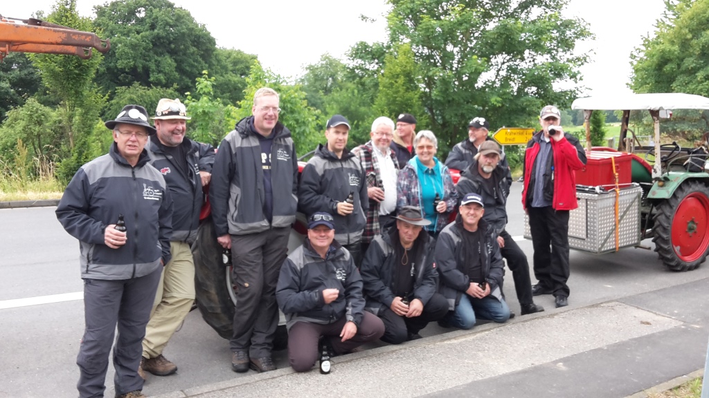 Bereits zum dritten Mal ist die Traktorgruppe aufgebrochen, um über kleine verschlungene Straßen, Feldwege und kleine Dörfer, nach Merten an die Sieg zu fahren. Den ersten „Boxenstop“ gab es in Kreuzhäuschen bei der Familie Jünnemann. Ein kühles Getränk wurde gerne angenommen.