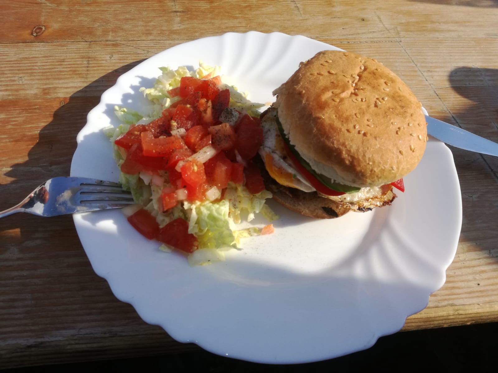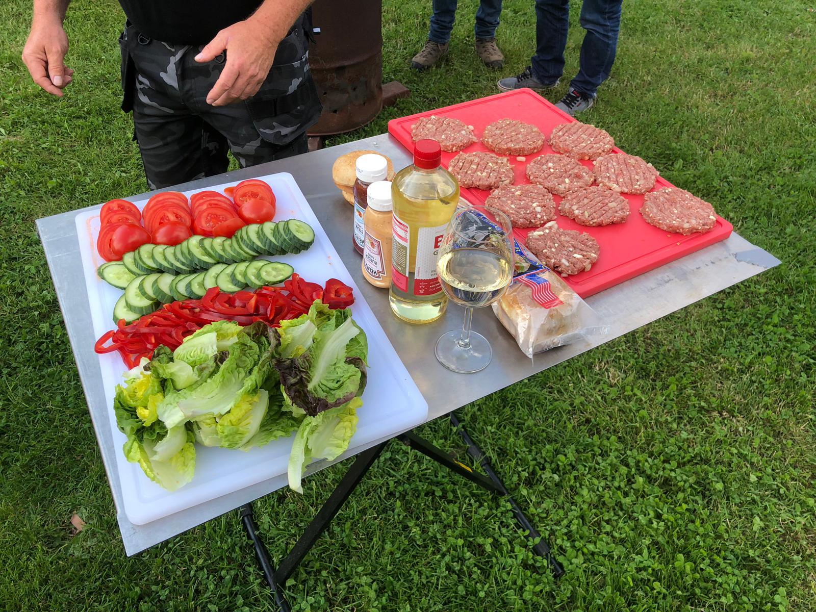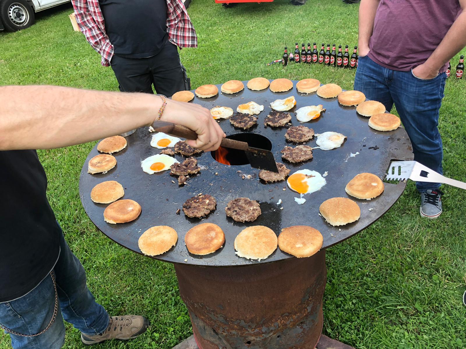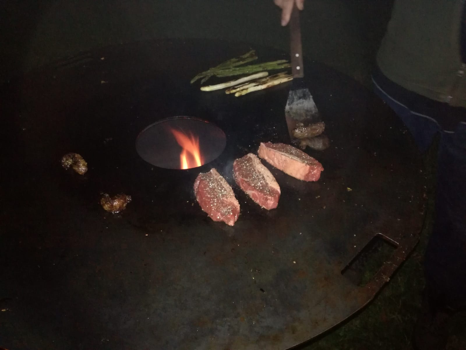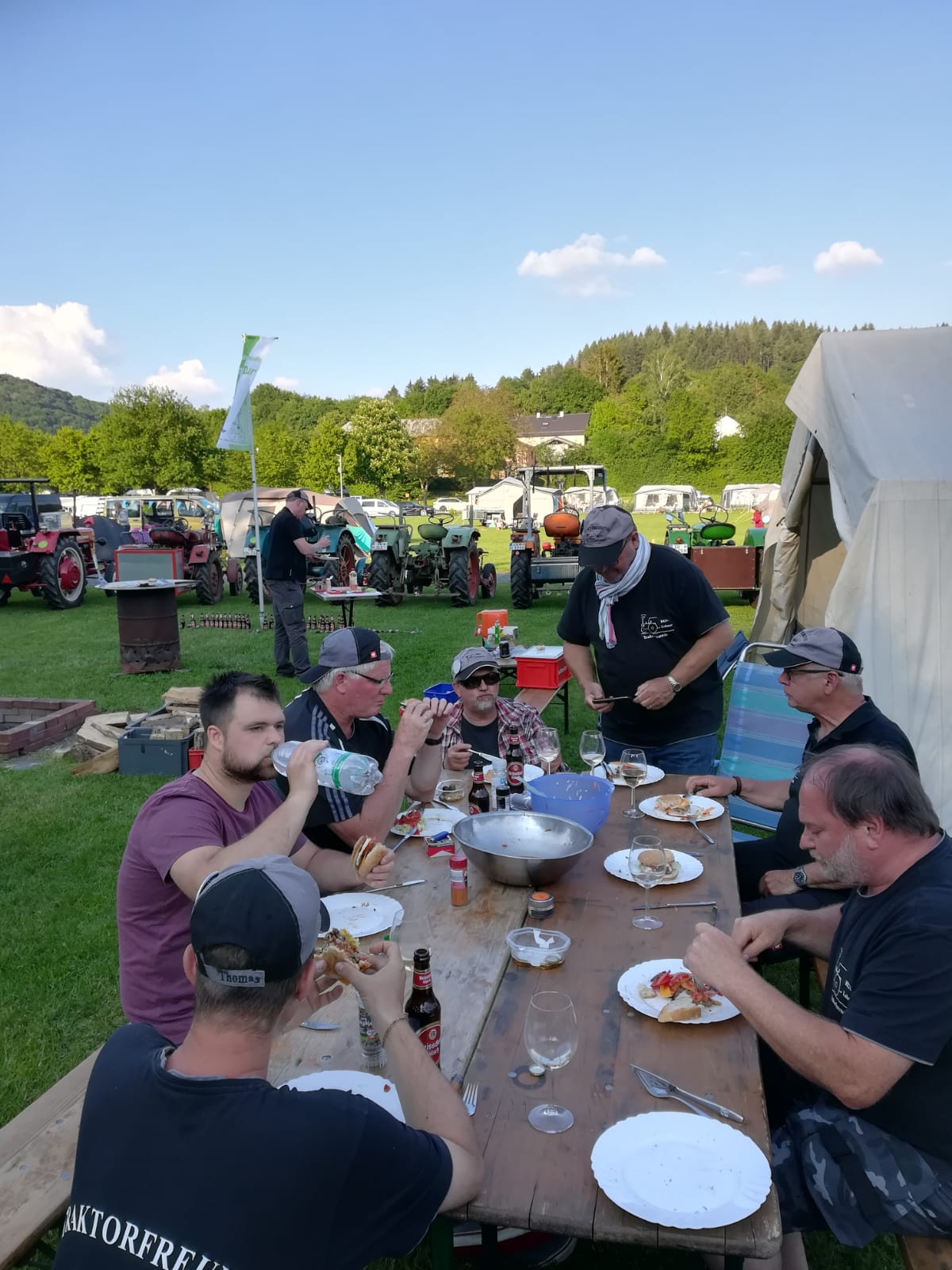 Unterwegs bei der Rast mussten wir die Traktoren am Winterscheider Berg in Höhe der Wendeliniuskapelle umsetzen – der Boden könnte den Acker zu sehr verdichten. Wir haben das gerne getan – auch wenn Schlepper mit Güllefässern um ein mehrfaches schwerer wiegen. Gut gestärkt – und die Raupe haben wir leben lassen (Danke Wolfgang, dass du sie nicht gegessen hast) erreichten wir Merten kurz vor 13 Uhr. Mit der für uns neuen Stellfläche haben wir uns schnell angefreundet und dann kam auch schon Dietmar mit dem Versorgungsanhänger. Zeitgleich wurden Zelte aufgebaut, die Feuertonne in Betrieb genommen und die Bruschetta frisch zubereitet. Kurz darauf kamen Daniel und Stefan zu Besuch und natürlich war damit der Nachmittagskaffee mit Teilchen gesichert. Jetzt war erst mal Zeit für Gespräche aber es musste natürlich auch erkundet und beobachtet werden, was denn sonst auf dem Platz los ist – Zeit zum Dösen im Stuhl war dabei auch. Nun wurde es aber Zeit – das Abendessen muss vorbereitet werden – also Spargel schälen, Pätties für die Burger formen und mit Feta verfeinern, den Chinakohl mit Möhren und den restlichen Tomaten und Soße anrichten, Rohkost für die Burger schneiden, der Feuerring ist gut geheizt und schon riecht es nach Burger und die Spiegeleier sind im Nu fertig. Jetzt noch die Weingläser und Teller parat – der erste Gang kann kommen. Als Zwischengang konnte dann noch der weiße und grüne Spargel genossen werden, gefolgt von gegrillter Ananas mit frischem Pfeffer – köstlich! Na ja- jetzt brauchten wir alle vor dem Hauptgang eine Pause. Am Lagerfeuer kein größeres Problem. Bei Einbruch der Dunkelheit und dann immer mal wieder kam es auf den Grill- das ein oder andere Rostbeef pikant mit Pfeffer gewürzt scharf angebraten und Medium gegrillt, auf Scheiben geschnitten – mit einer Prise Meersalz abgeschmeckt und dann Stück für Stück direkt serviert – Köstlich!
