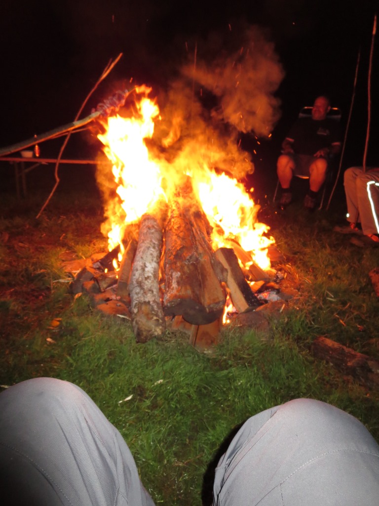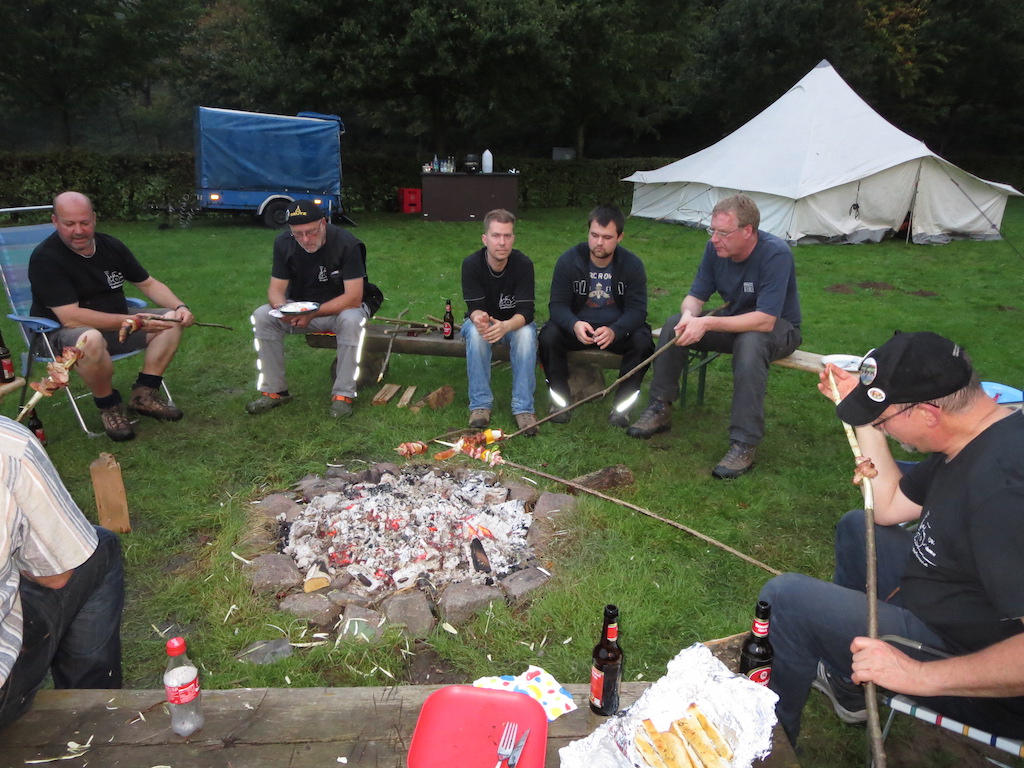 Im T-Shirt wurde am offenen Lagerfeuer und kalten Getränken bis in die frühen Morgenstunden so mancher Grillspieß verputzt. Leider setzte in der Nacht ein starker Sommerregen ein was den Lagerplatz etwas unter Wasser setzte. Aber im Schutze der Pfadfinderzelte blieben die Teilnehmer relativ trocken.