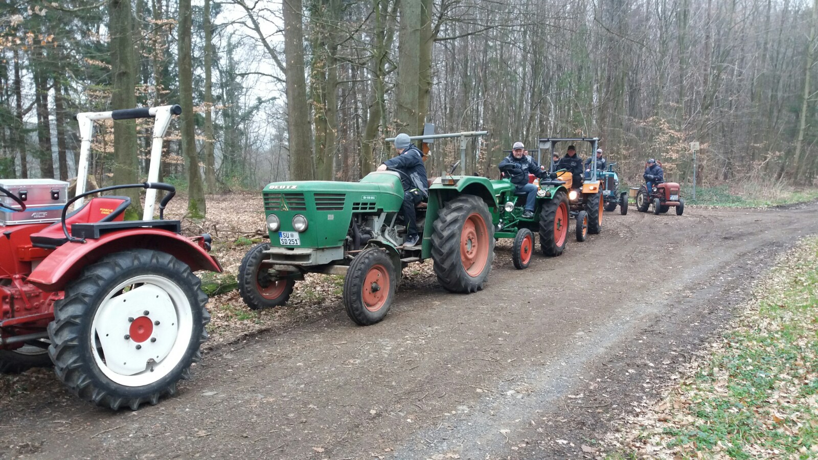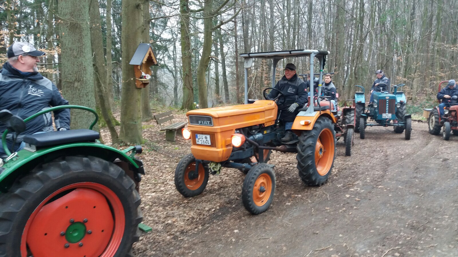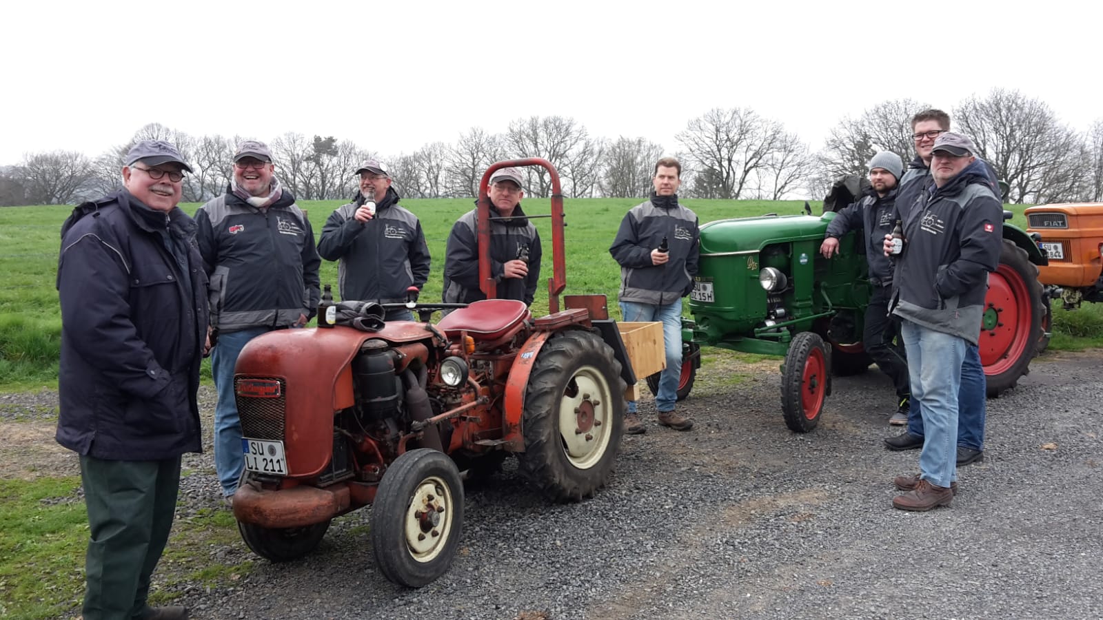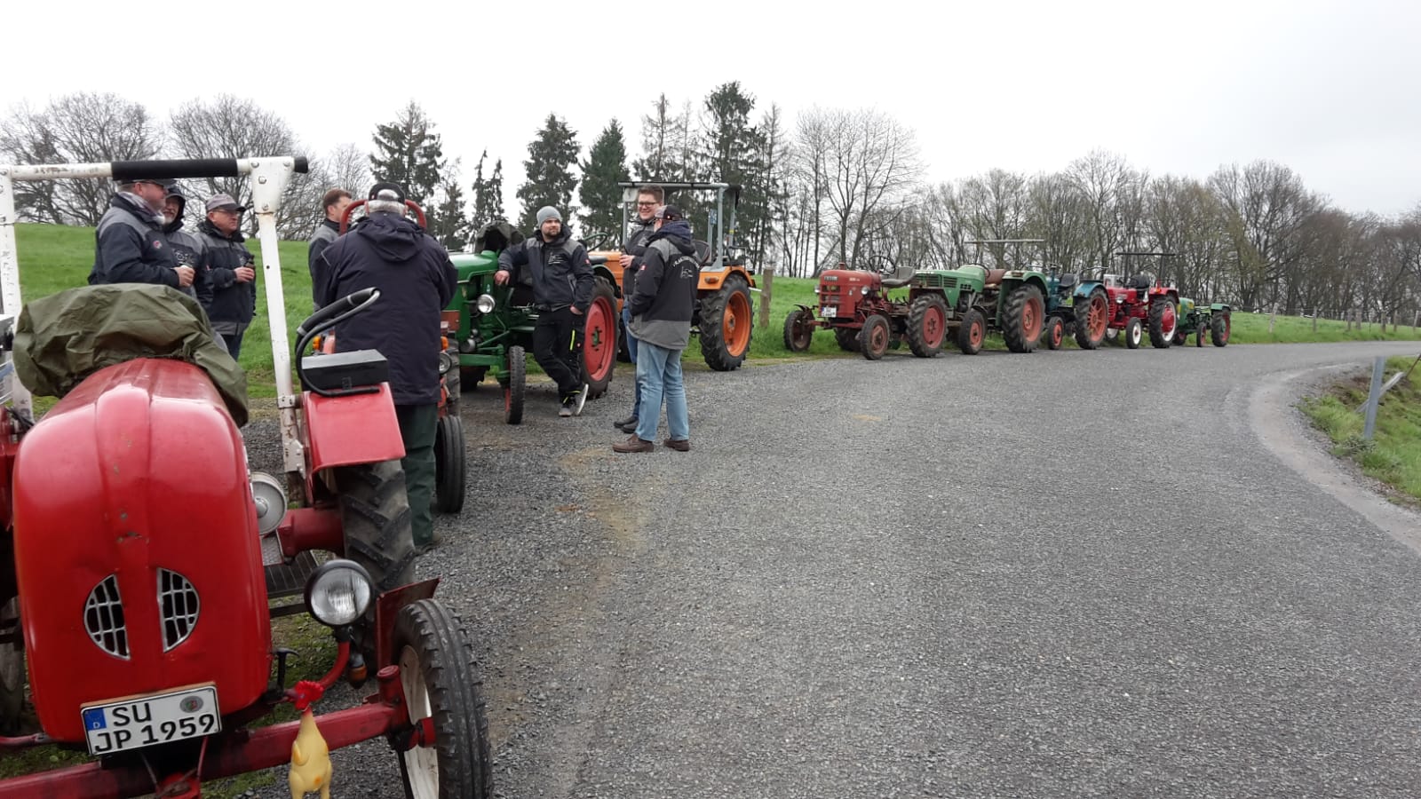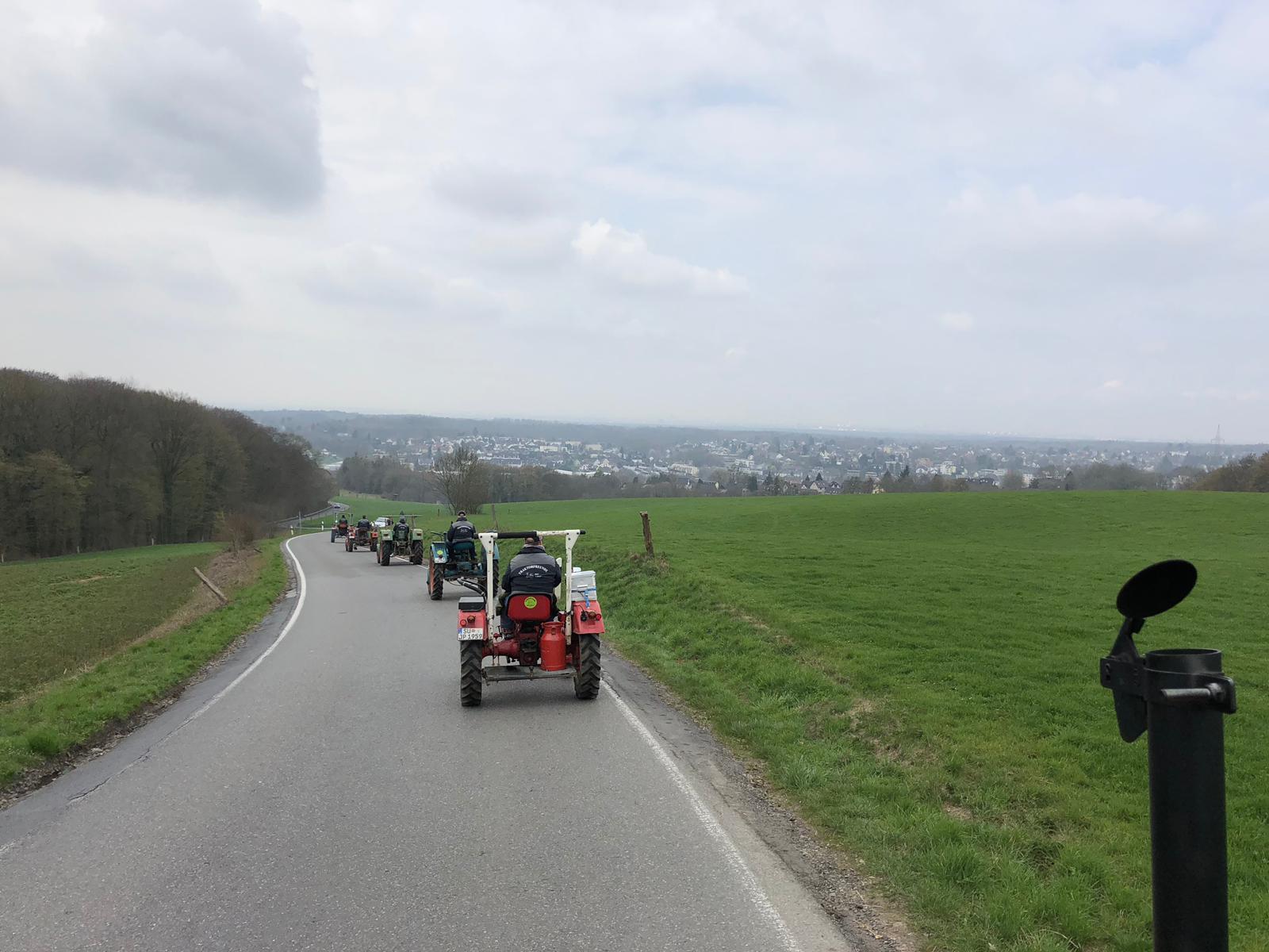 Pünktlich zum Frühlingsanfang stehen gleich neun Traktoren mit ihren Fahrern vor dem HGV Haus zur ersten gemeinsamen Ausfahrt in diesem Jahr bereit. Viele Sträucher und Bäume stehen durch die letzten Sonnentage in voller Blüte oder im jungen Grün. Es geht ab und zunächst wird eine Ehrenrunde durch die Schmiedgasse gedreht. Danach geht es durch den Ingerberg nach Algert durch Salgert und in Grimberg runter zur Naaf. An Hausen vorbei geht es Richtung Höffen und dann runter ins Aggertal nach Wahlscheid. Unterhalb von Schönenberg legen wir bei ersten Sonnenstrahlen eine kleine Pause ein. Danach queren wir beim Aggerschlößchen das Aggertal und weiter geht es Richtung Gammersbachertal. Vorbei an der Burg Schönrath und schließlich ins Sülztal. Hier verlassen wir unser Stadtgebiet und die Sonne kommt jetzt dauerhaft zum Vorschein. Bei der Fahrt ins Tal genießen wir die Aussicht auf Köln und fahren dann weiter in die Wahnerheide. Nach einer ausgiebigen Rast beim Bambi (wir sitzen die ganze Zeit draußen in der wärmenden Sonne) geht es schließlich über Altenrath zurück nach Lohmar.