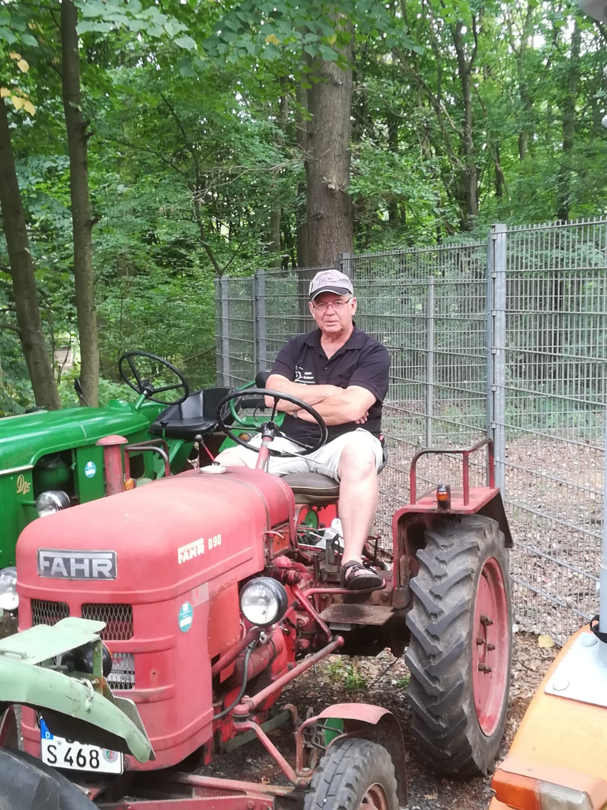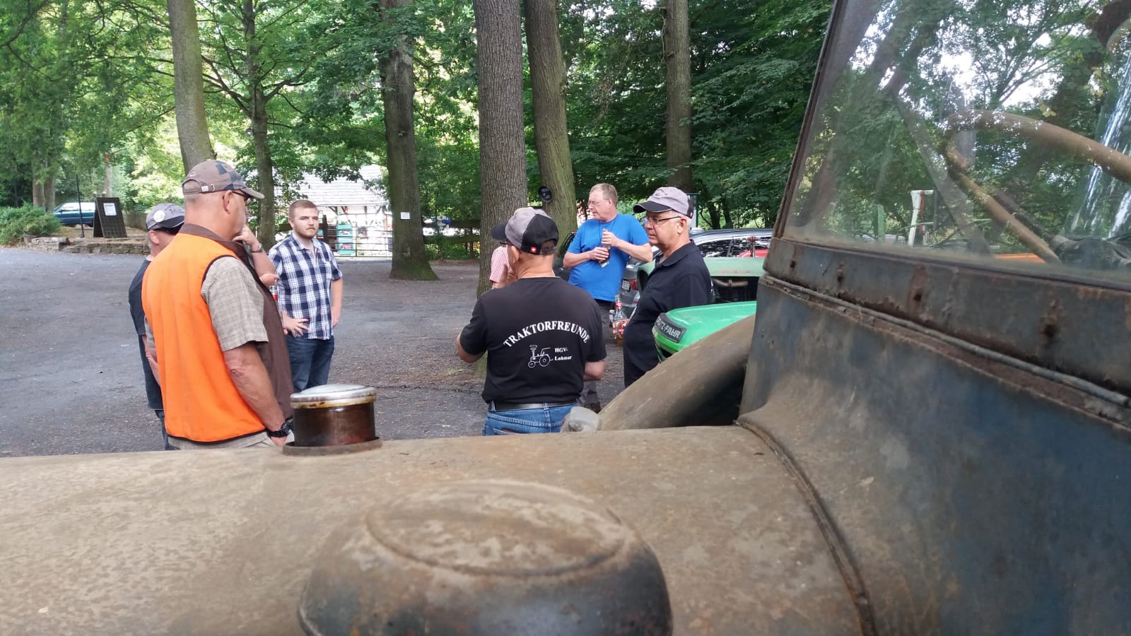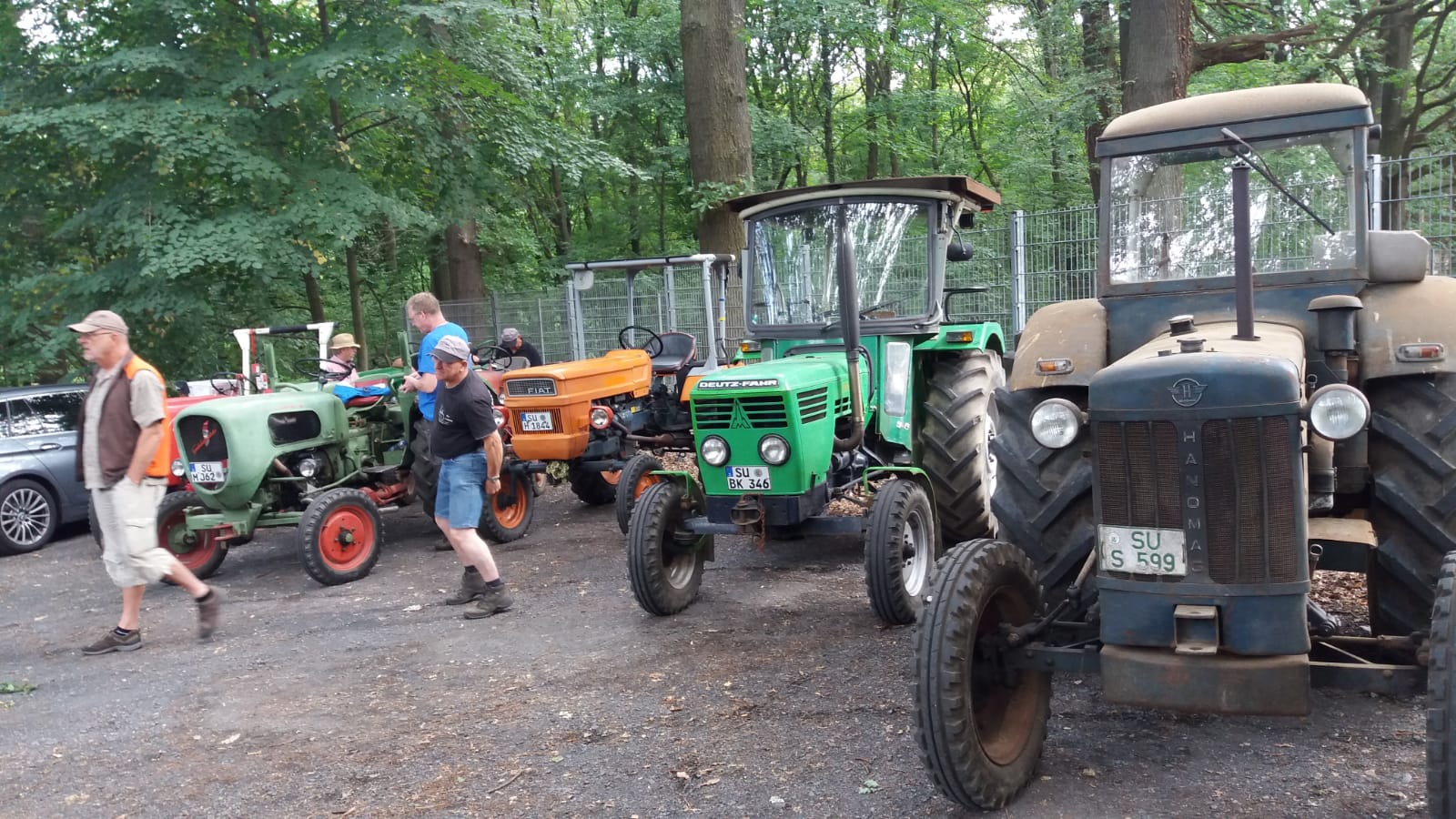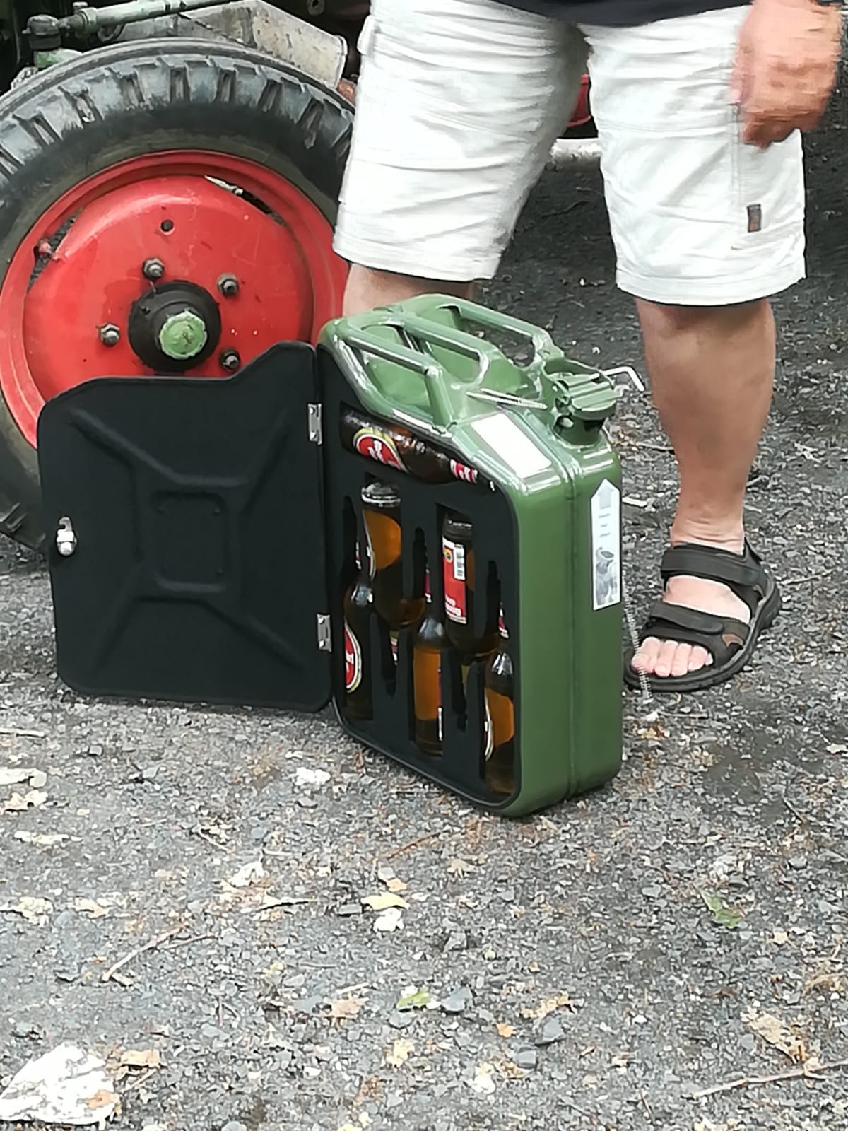 Der bisherige Hitzerekord dieses Jahres in NRW ist erreicht: Am Donnerstag (26.07.2018) stiegen in unserer Nachbarstadt St. Augustin die Temperaturen auf 38,3 Grad – so meldet es die ARD in den Nachrichten. Auch wenn für unsere geplante Fahrt nach Köln die niedrigsten Temperaturen der Woche gemeldet wurden (nur um die 30 Grad) – für die Kühler, unsere Öle in den Traktoren aber auch für uns selber – es ist viel zur heiß um sich gut 6 Stunden für eine Strecke von rd. 80 km auf den Traktor zu setzen. Köln wurde abgesagt und eine Kurzstrecke zum Heidekönig als „Schattenfahrt durch den Wald“ von Hajo vorgeschlagen. Kurzfristig stoßen so noch weitere Traktoristen zu uns. Mit sieben Traktoren holen wir noch „Jert“ als VIP ab – die Nachbarschaft war nahezu komplett „aus dem Häuschen“, als wir vom Wendehammer zurück durch die Sackgasse kamen. Ein besonderes Zubehör hatte Wolfgang erstmals dabei. Alle fragten sich, was der denn mit einem 20 Liter Reservekanister will. Bei der Rast wurde das Geheimnis gelüftet: Hinter einer seitlich angebrachten verschlossenen Türe ist reichlich Platz für eiskalte Getränke – natürlich ist der Öffner auch fest im Füllstützen eingebaut. Ein Unikat – zum Abschied von den Kollegen – Toll und von uns für gut und sehr nützlich befunden!