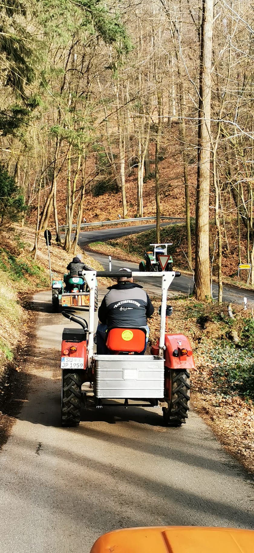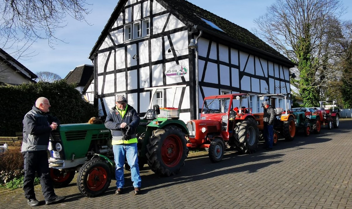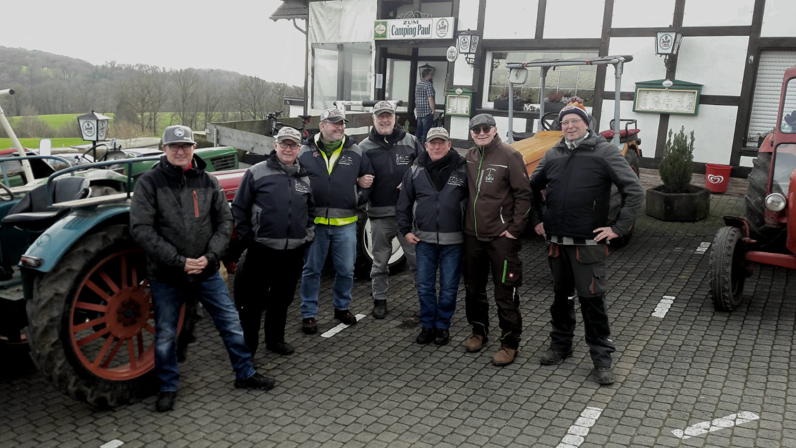 Bestes Winterwetter mit reichlich Sonne hatte uns gestern schon verwöhnt und heute nochmal. Was für ein Geschenk! Die Temperaturen liegen zwar über Null, aber die meisten Pfützen auf unseren Wegen sind gefroren und an wenigen Stellen sind die vom Wasser überzogenen Wege spiegelglatt. Nichts kann uns abhalten: Eis von der Windschutzscheibe kratzen braucht bei uns niemand - so etwas findet man an unseren Traktoren nicht. Startschwierigkeiten mit der Batterie sind schnell behoben, wenn Du von der Gruppe am HGV-Haus vermisst gemeldet bist – sehr zur Freude der Nachbarn.