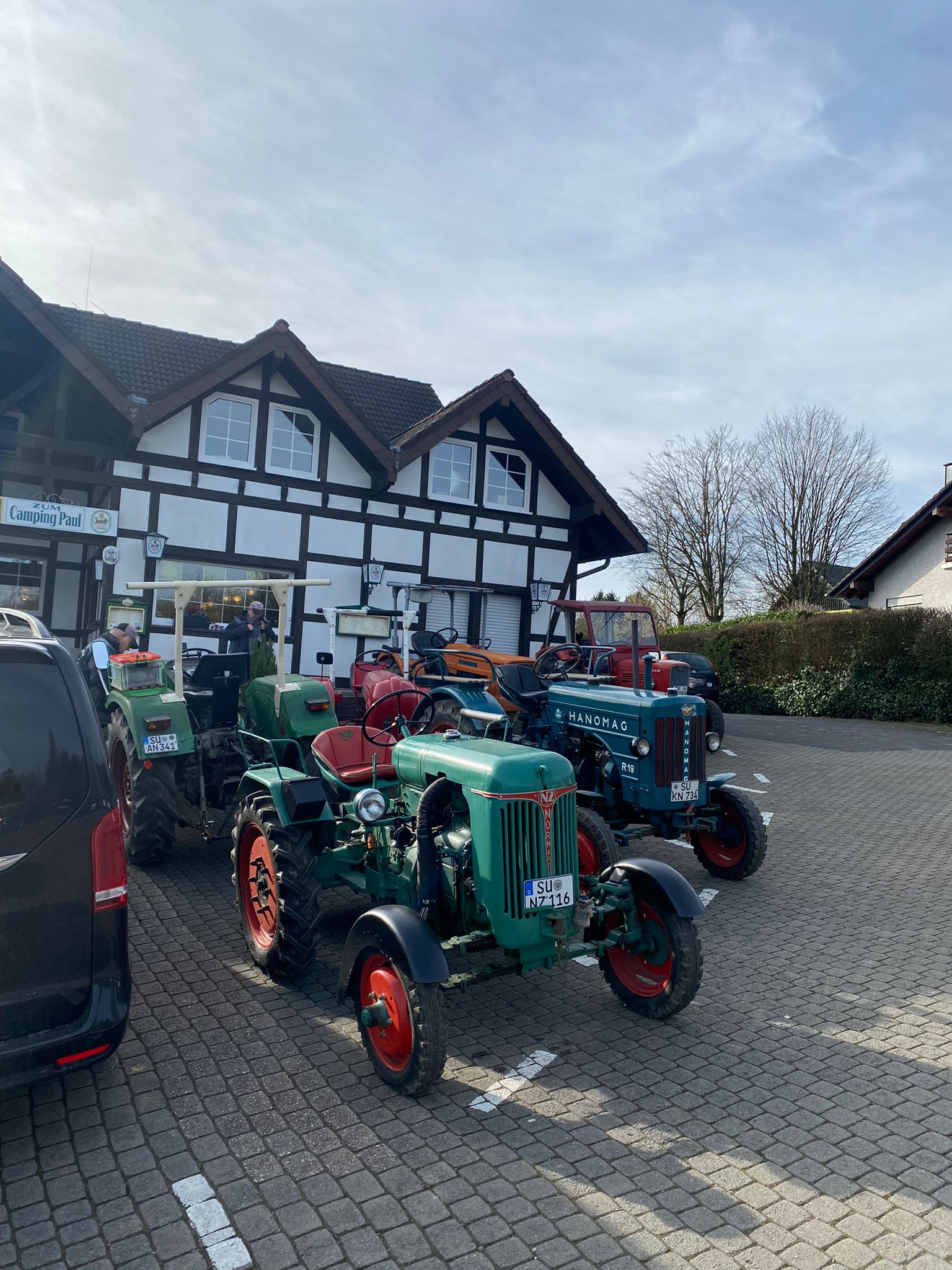 Hans hat die Tour über Algert, Seelscheid, Ingersauel und Mohlscheid sehr gut geplant und während der Fahrt hat Frank Treibgut (ein verloren gegangenes Handy) gesammelt. Eine Pause - nicht nur zum Aufwärmen - beim „ Camping Paul“ wurde pünktlich um 12:00 Uhr angefahren. Reichlich und bestens gestärkt ging es dann über den Höhenrücken mit einigen Abstechern rechts ins Aggertal und links ins Naafbachtal auch schon wieder zurück. Oberhalb von Naaferberg trennen sich für heute die Wege der Lohmarer von den Algertern Traktorfreunden.